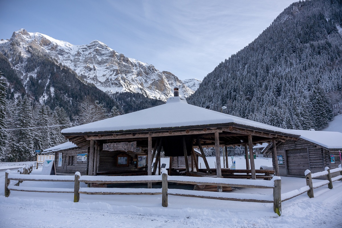 Covered space arranged in Grand-Paradis near the campsite and the car park with a fireplace, a kitchen area, tables and toilets.