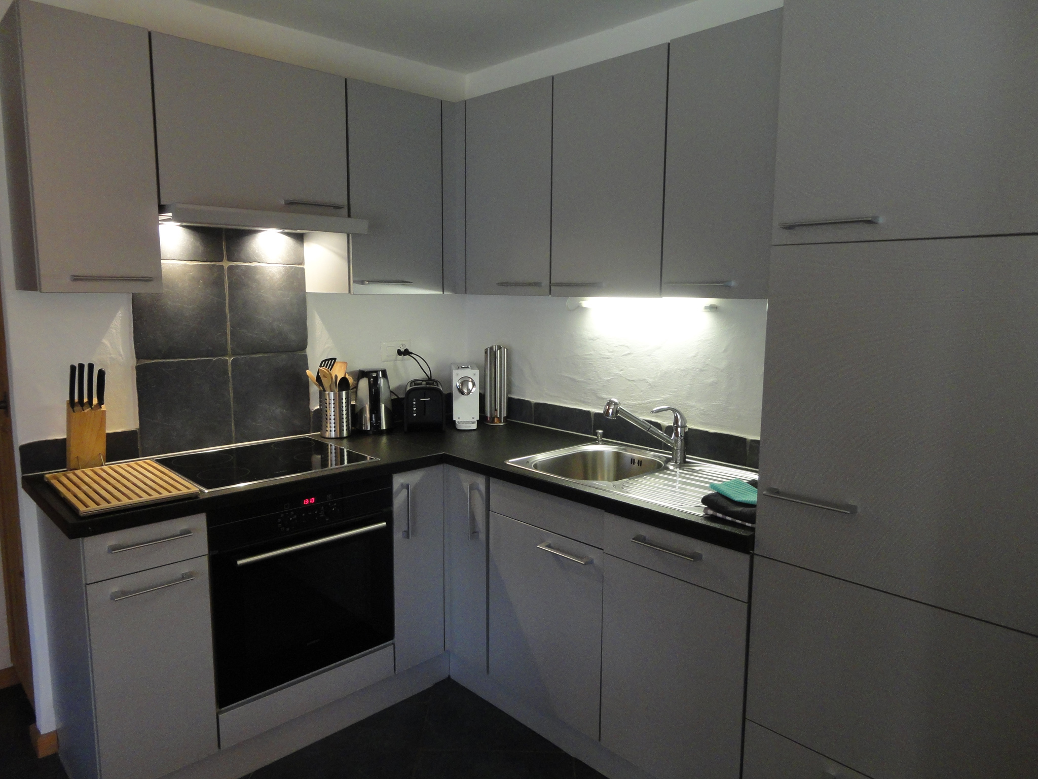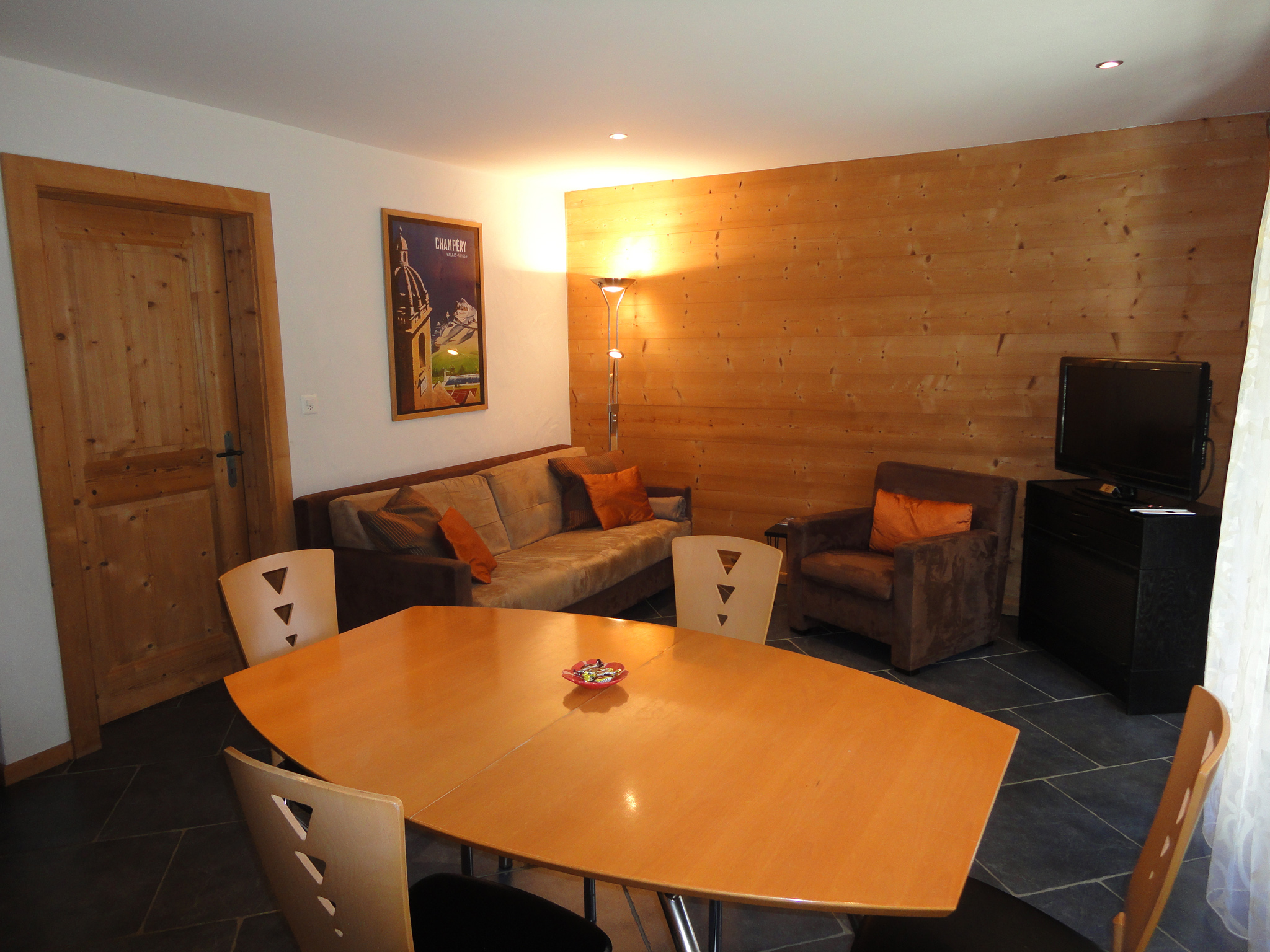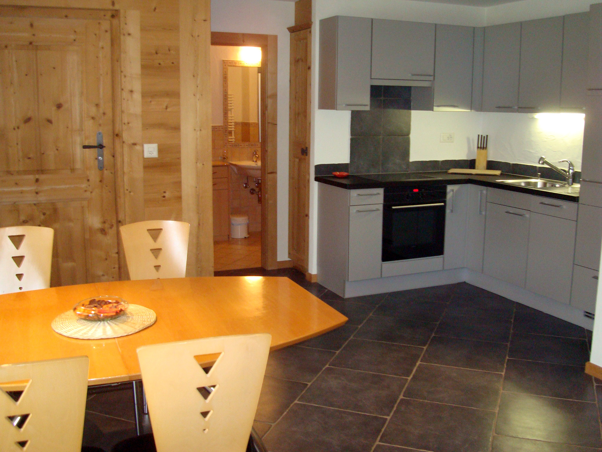 2.5 Zimmerwohnung (45 m2, Erdgeschoss), für 4 Personen, bestehend aus: Wohnzimmer (TV, wifi) mit Essecke, offene Küche (Glaskeramikherd, Ofen, Geschirrspüler), ein Schlafzimmer mit 1 Doppelbett (160×200) und Ankleideraum. Ein Badezimmer (Dusche/WC) mit Waschmachine, eine Terrasse.