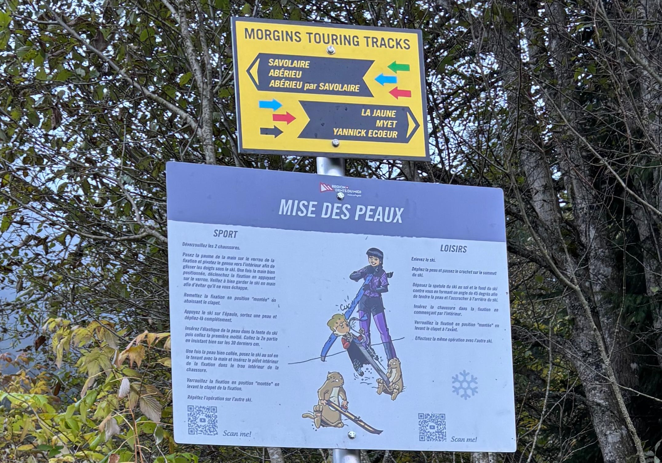 Tafeln mit Erläuterungen und Links zu Videos entlang der Strecke laden Sie dazu ein, die verschiedenen Gesten des Skialpinismus zu üben (Spitzkehre, Felle auf- und abziehen, schaufeln, sondieren, LVS Recherchen, Materialpflege).