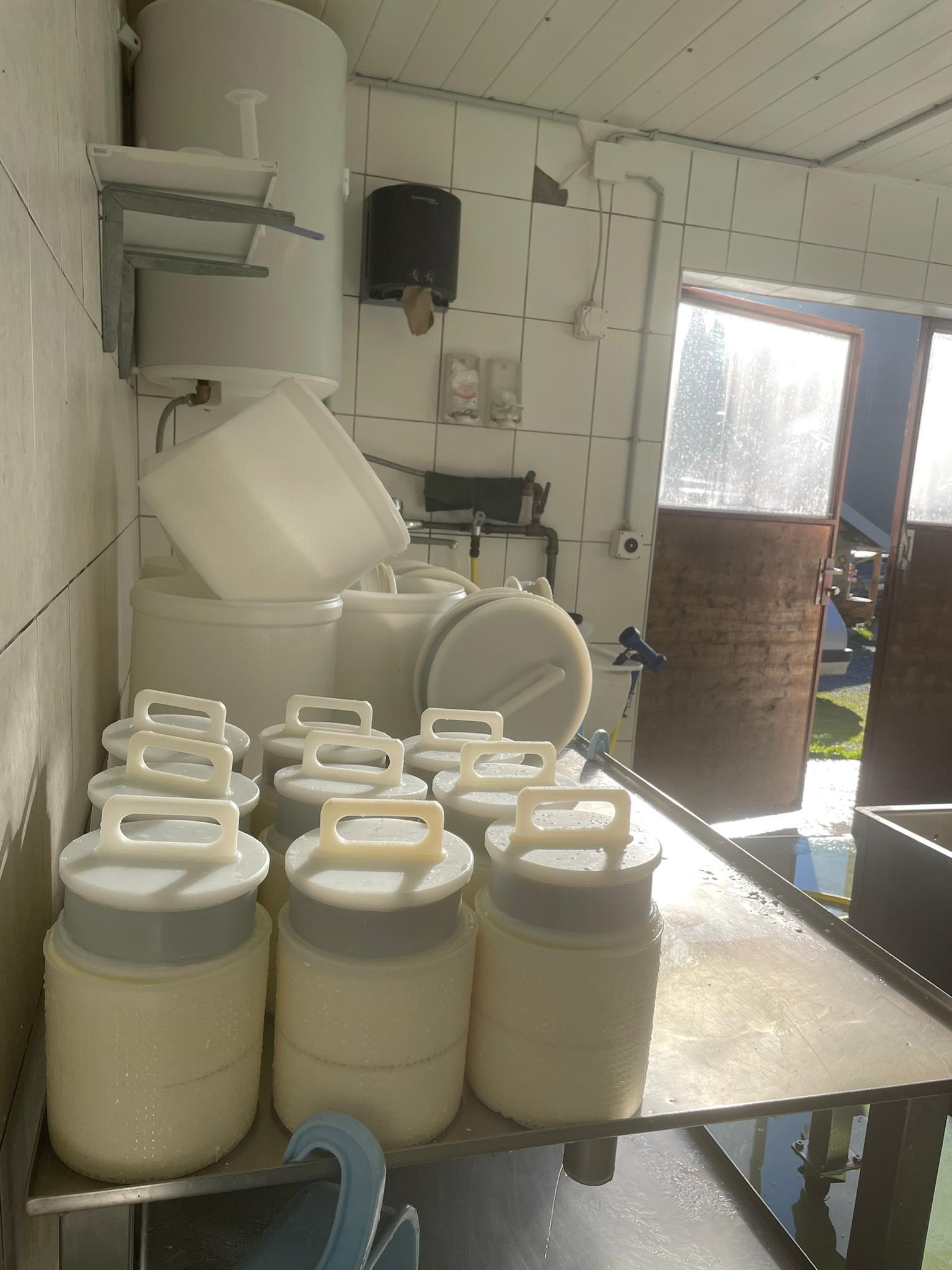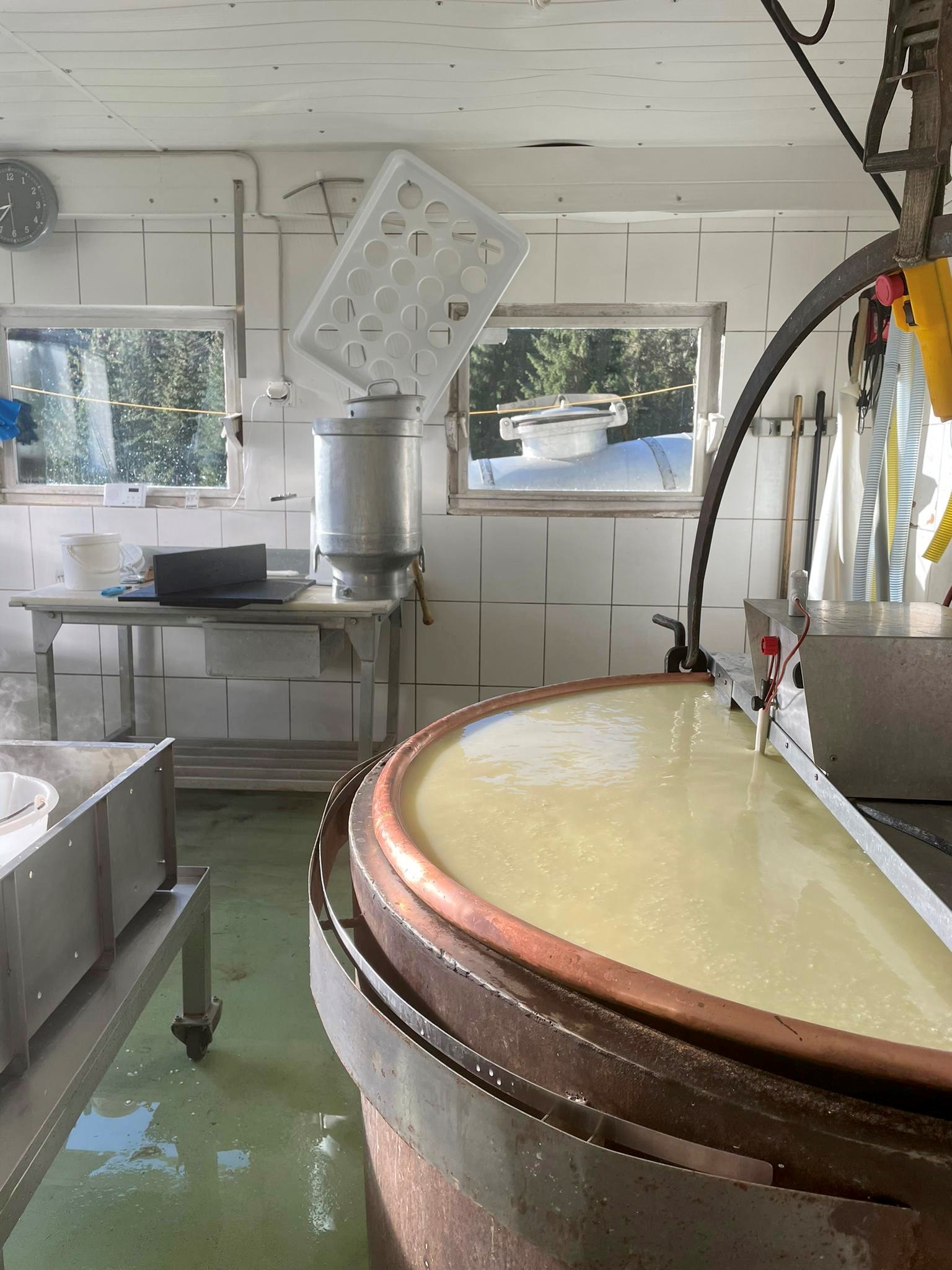 Gegen 07:45 Uhr findet das Entkernen statt, ein Schlüsselschritt bei der Käseherstellung, da wir ab diesem Zeitpunkt die Käsekörner haben werden. Danach werden die Körner erhitzt, bis die gewünschte Textur erreicht ist. Während dieser Wartezeit nutzen wir die Gelegenheit, den Käsekeller zu zeigen. Gegen 9:00 Uhr wird der Käse herausgenommen und in Formen gefüllt, danach lassen wir unsere verschiedenen Produkte probieren.