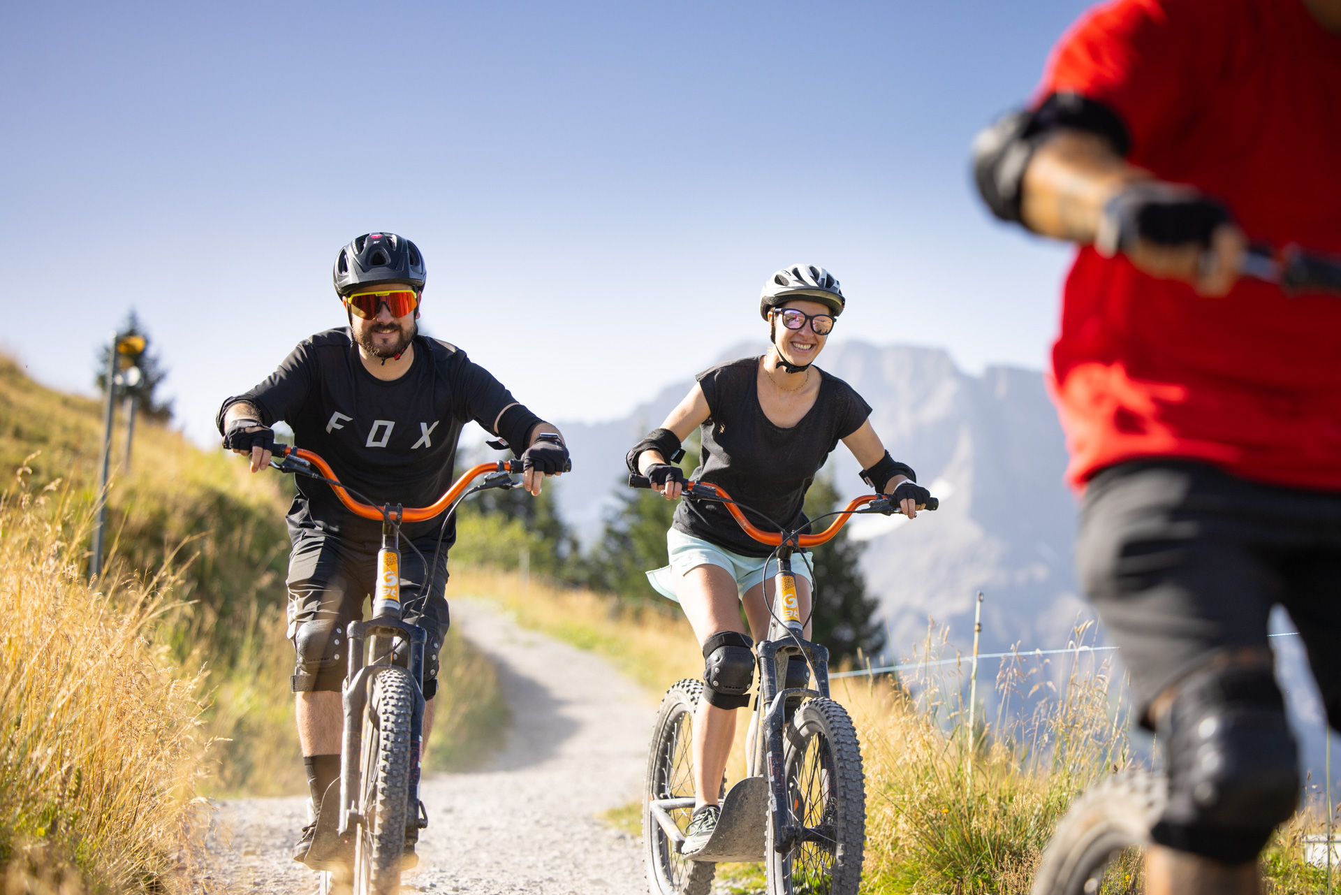 Ob mit Familie oder Freunden, entdecken Sie die ganze Pracht des Gebiets Portes du Soleil und tanken Sie Emotionen mit Abfahrten auf Tretrollern!