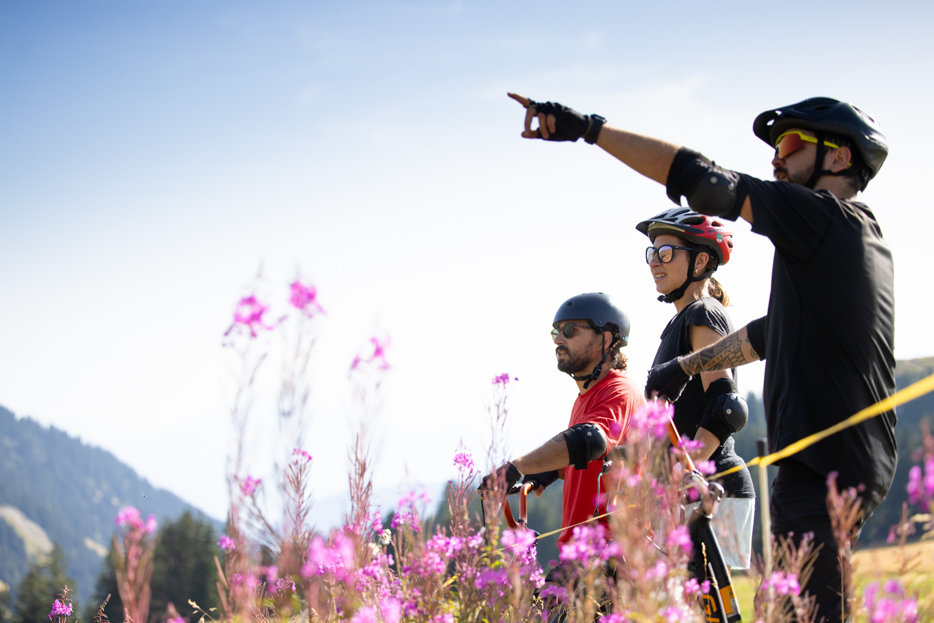 Ob Sie sich für eine freie Fahrt oder eine geführte Abfahrt entscheiden, rasen Sie mit All-Terrain-Tretrollern die Hänge von Champéry hinunter, ausgestattet mit Federung und Scheibenbremsen.