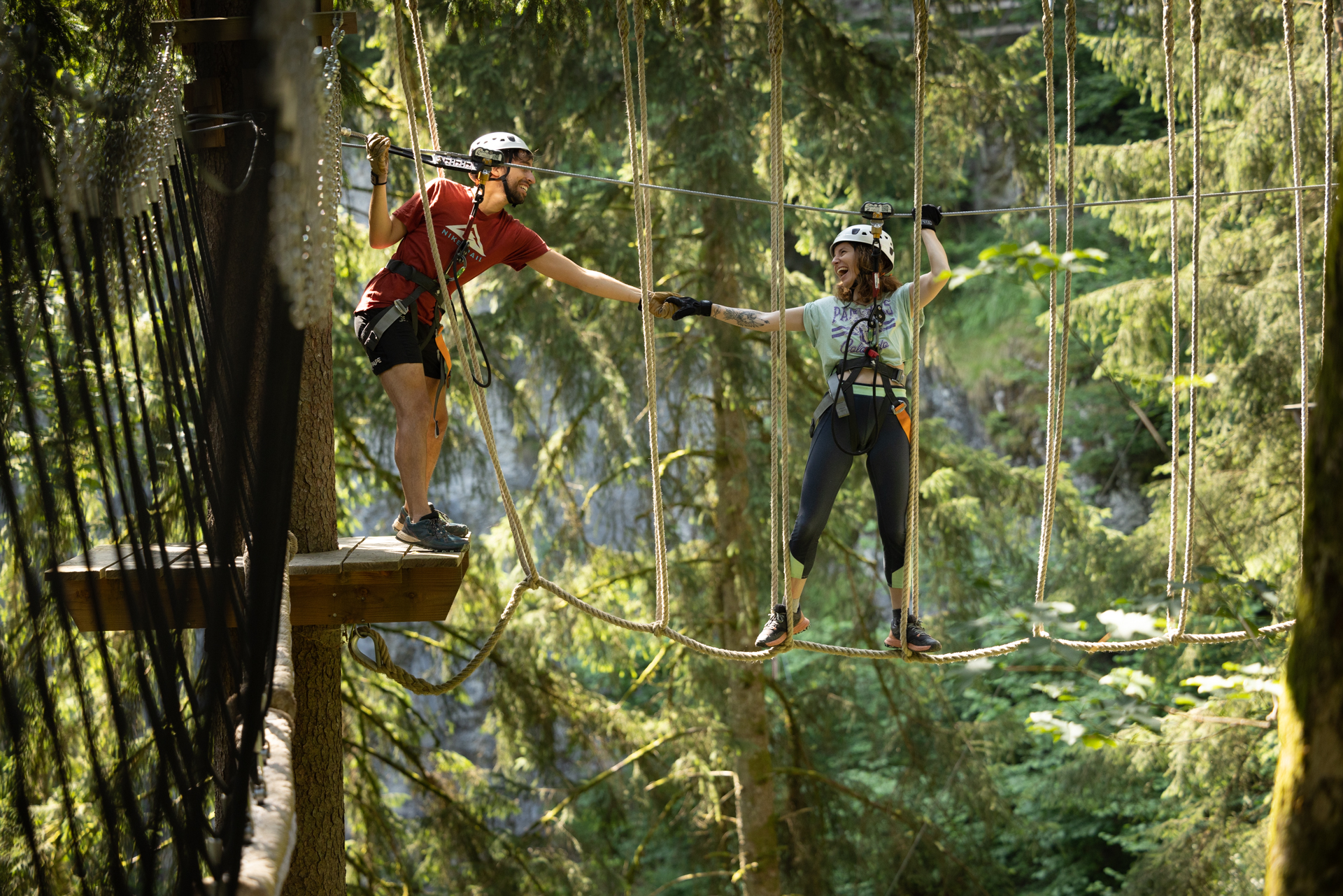 Teilen Sie mit Ihrer Familie ein einzigartiges, immersives Erlebnis mit unserem neuen Sommerangebot! Nehmen Sie Kurs auf die Cascade de la Saufla auf einer Kani-Wanderung mit einem Husky und halten Sie dann im Organic Adventure Park für eine spielerische Escape-Session in den Bäumen an.
