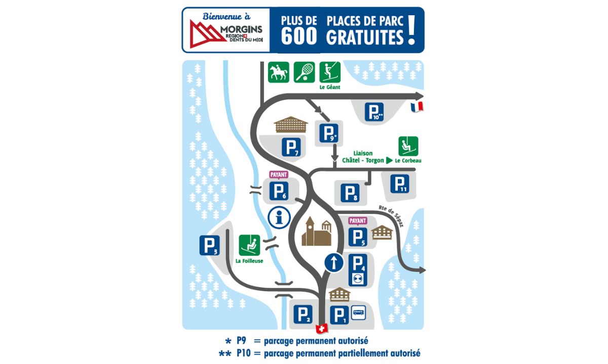 Der Parkplatz P11 befindet sich in der Nähe des Sessellifts Corbeau in Morgins.
