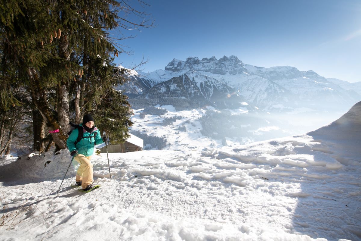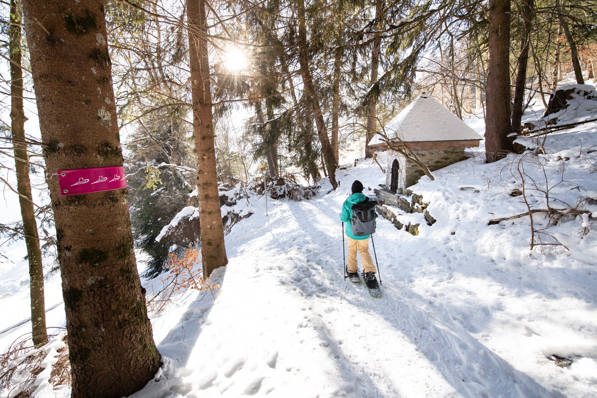 Folgen Sie dem Schneeschuhpfad Nr. 2, der Sie in etwa einer Stunde zum Sessellift Chaux führt. -