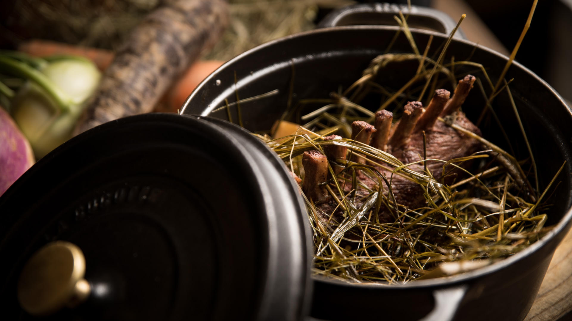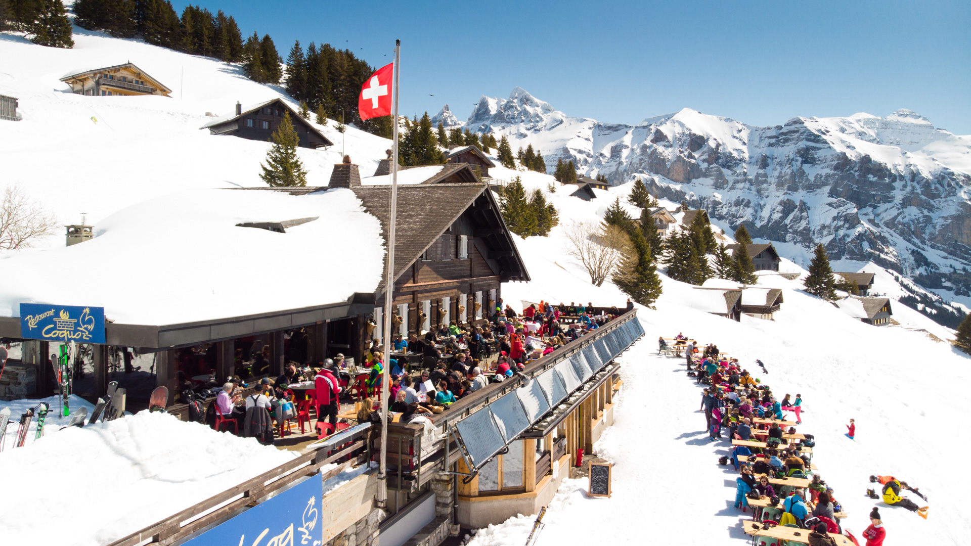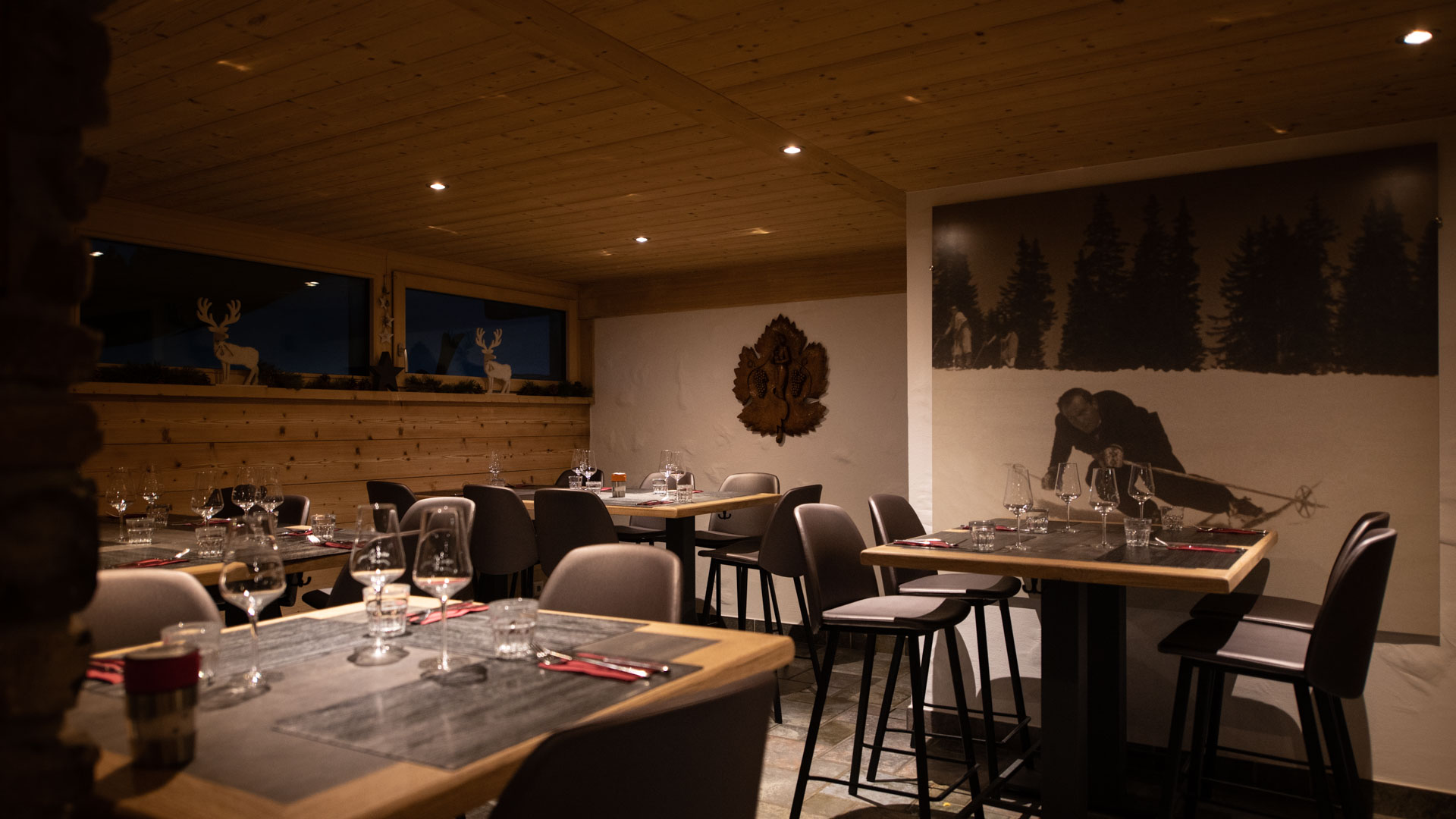 When the weather is clement, diners on the sun-warmed terrace enjoy panoramic views of the Dents du Midi and Dents Blanches mountains, as well as the imposing Ruan Glacier. On snowy days, clients vie for the coveted, cosy spots by Coquoz’s iconic fireplace.
