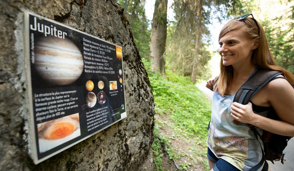 Set off under the giant orange arch that represents the sun, at the entrance to the Vallon de They (route de Chésery) just after the Morgins Ranch. Follow the path further and further into outer space, passing by the planets of the solar system on your way. Each step you take corresponds to 1 million kilometres in space and each planet you pass by is sized to scale and has its own informational panel to discover.