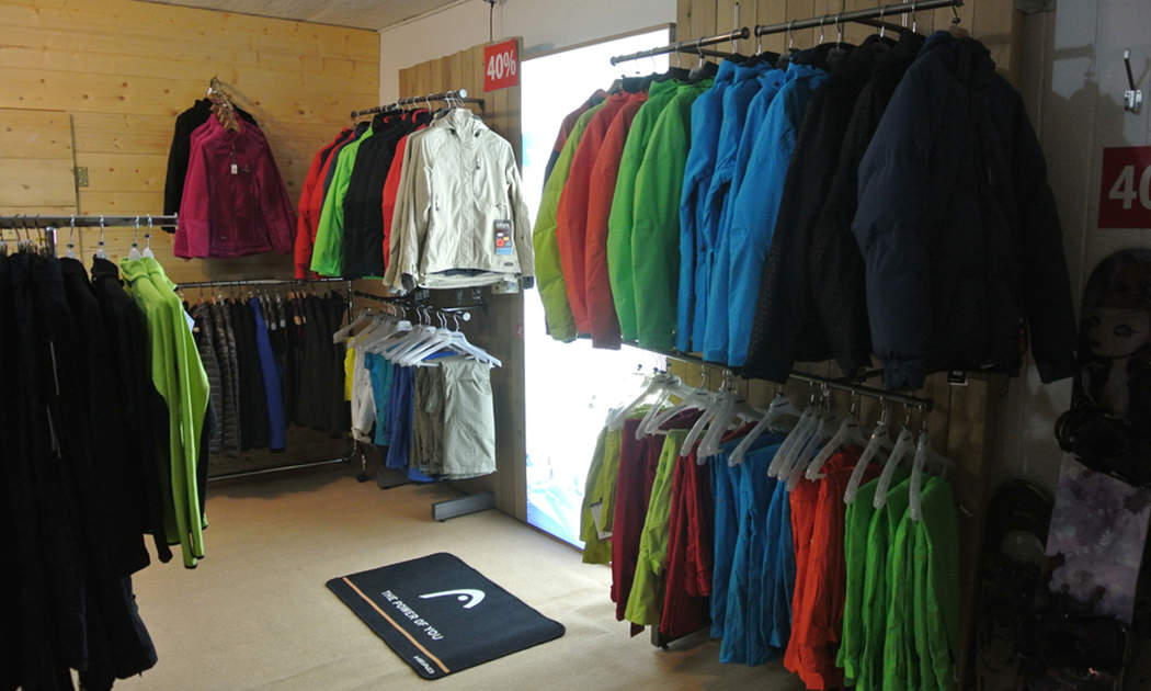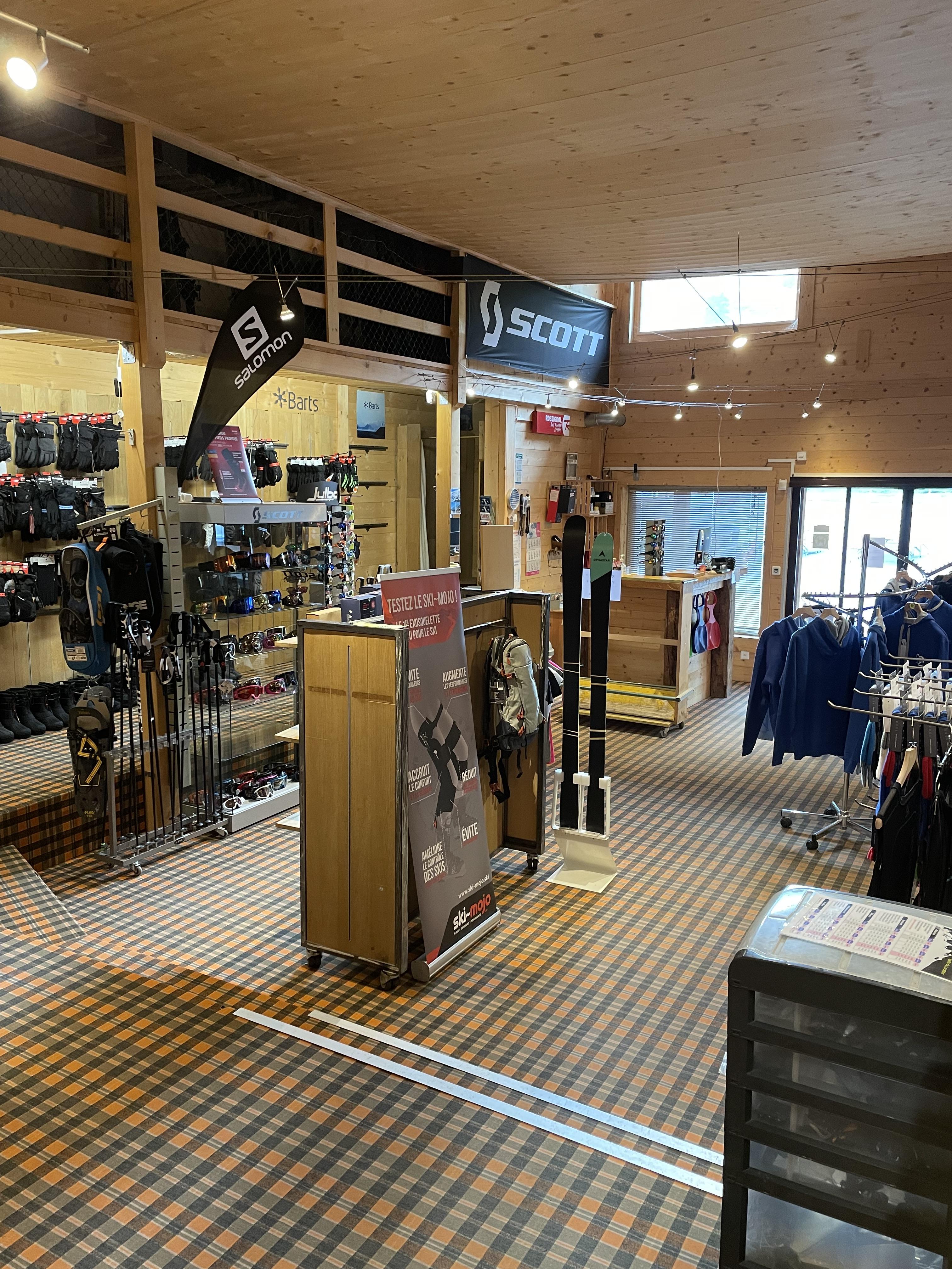 Winter sports shop offering ski, snowboards, ski boots and boots for rent and sale.