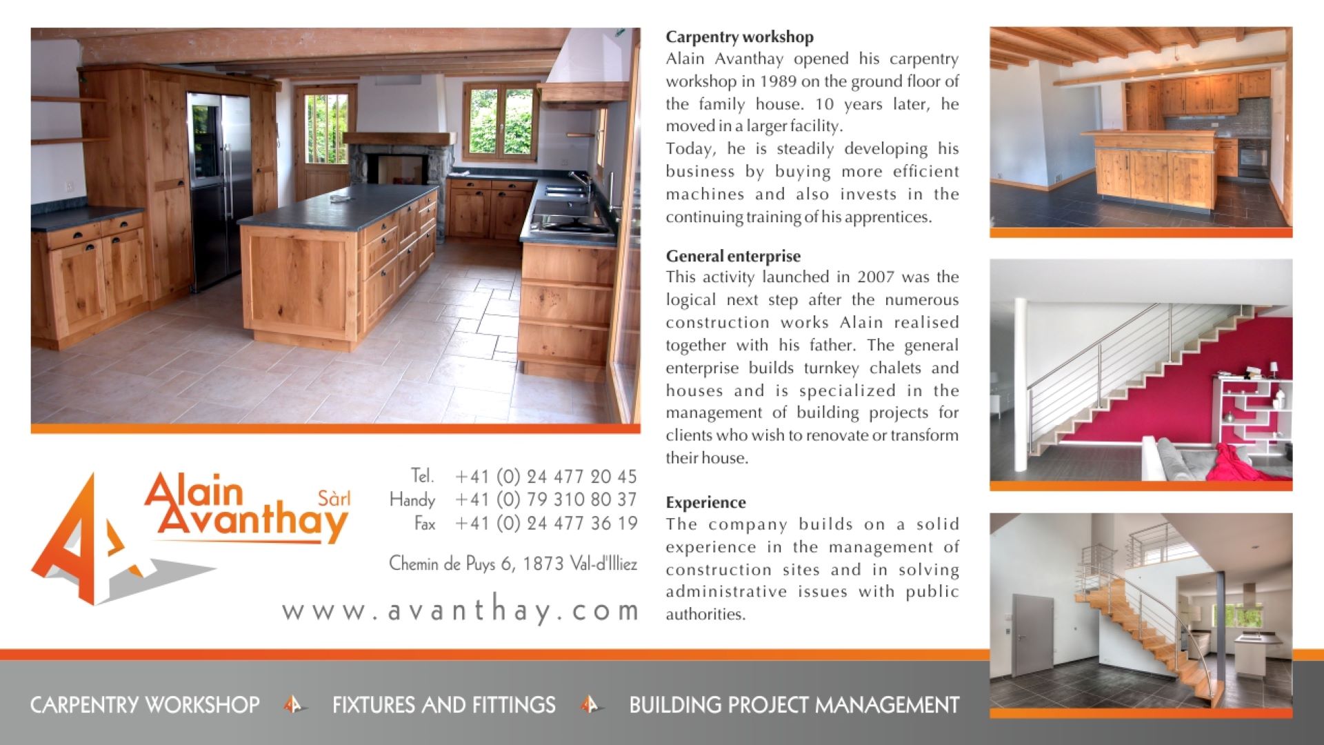 Alain Avanthay opened his carpentry workshop in 1989 on the ground floor of the family house. 10 years later, he moved in a larger facility. Today, he is steadly developing his business by buying more efficient machines and alos invests in the continuing training of his apprentices.