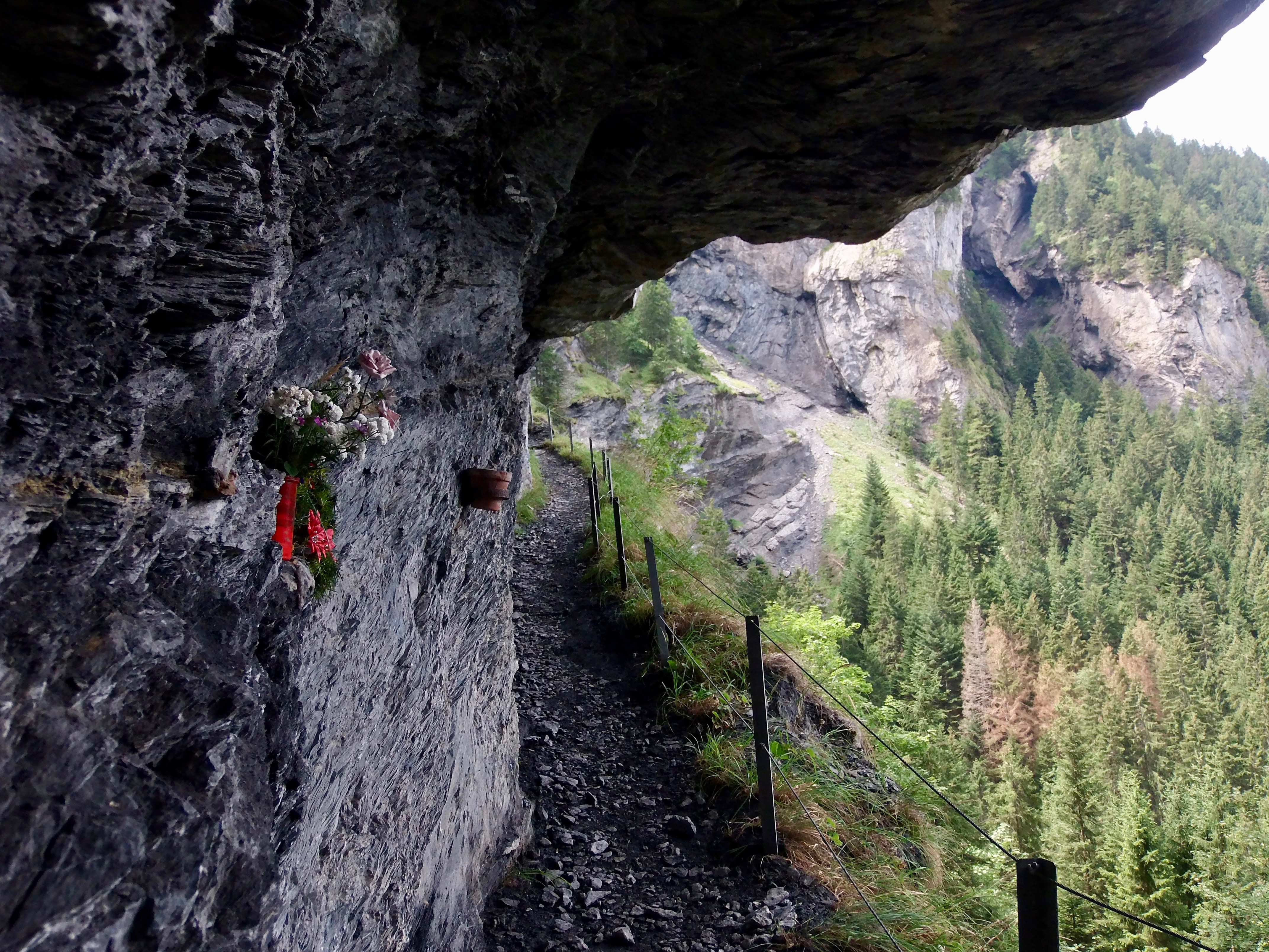 Informational panels on glaciers and the water cycle dot this section of the path, as it continues towards the Rossétan mountain pasture and heads downhill to ‘Roc Coupé’, a passage carved into the cliff and equipped with chains – more impressive than technically difficult.