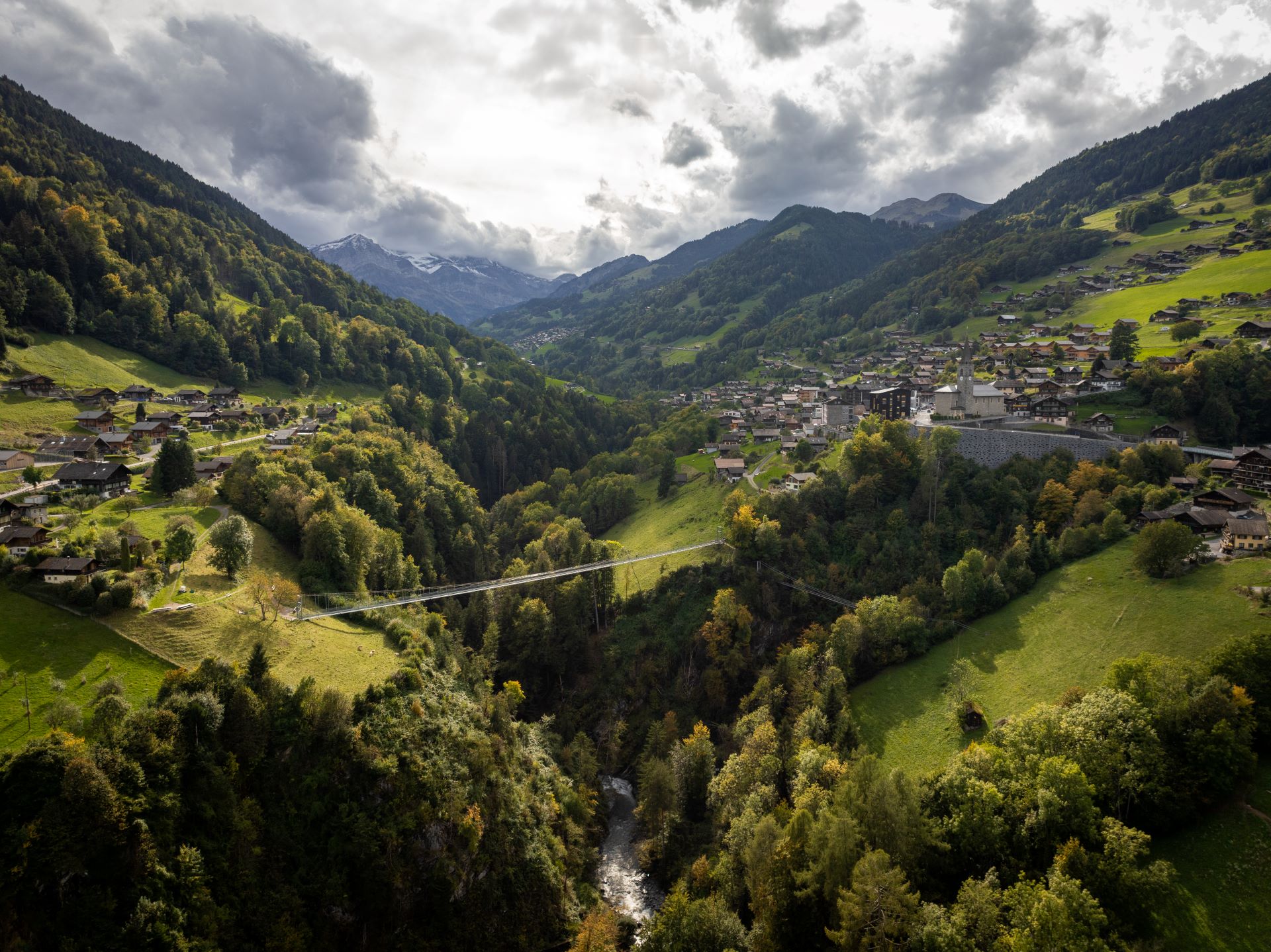 185 meters long and soaring 75 meters above the riverbed, this feat of aerial engineering is the 4th longest footbridge in Valais. It was built to encourage sustainable mobility, as part of a project intended to safeguard the drinking water supply between the left and right banks of the Vièze River.