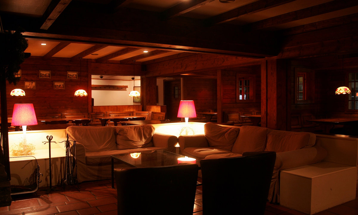 Le Carnotzet bar-restaurant-pizzeria offers a modern take on traditional, chalet-style decor.