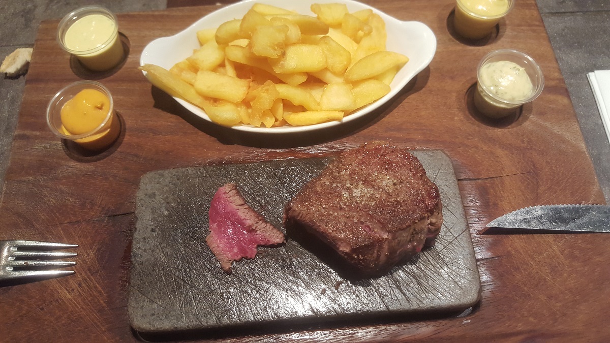– Viande de bœuf sur pierre accompagnée de frites Belges