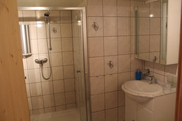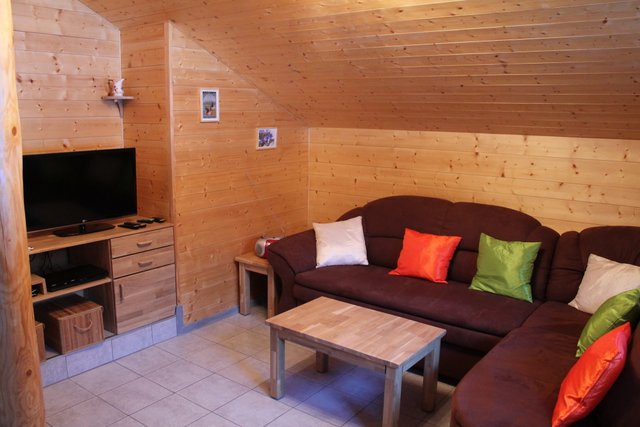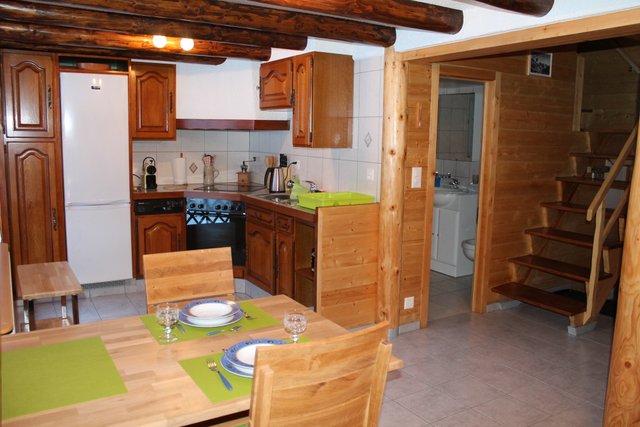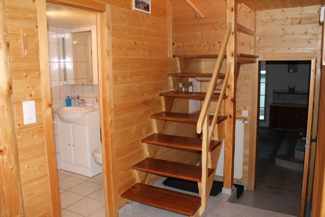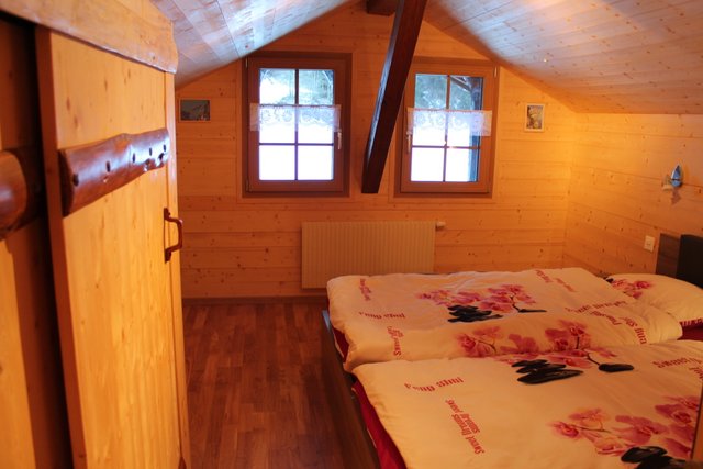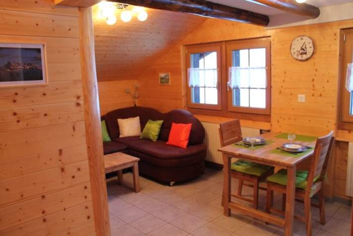 Appartement de 2 pièces en duplex (45 m2, 1er et 2ème étage) pour 3 personnes qui comprend : salon avec canapé-lit (1 couchage) (TV, Wifi), coin repas, cuisine ouverte (cuisinière vitrocéramique, lave-vaisselle, four, micro-onde, grille-pain, machine à café, set à fondue, four à raclette), une salle de bain (douche/WC), balcon. A l’étage : une chambre avec un lit double, une toilette (lavabo/WC). A l’extérieur : terrasse privée équipée derrière le chalet, 2 places de parc, et local à skis et à vélos indépendant et fermé.