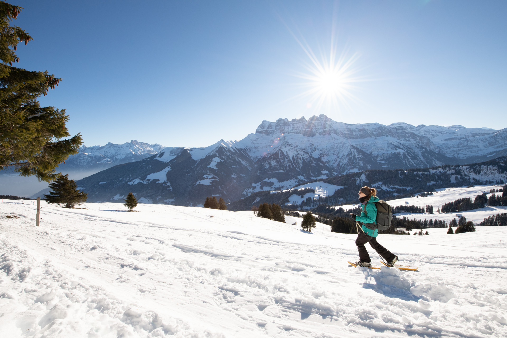Cet itinéraire en raquettes offre à mi-parcours une superbe vue sur les Dents du Midi et les Alpes vaudoises.