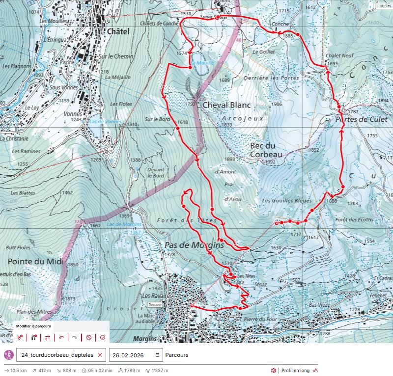Alerte visiteursCet itinéraire n'est pas balisé "Tour du Corbeau". Veillez à prendre la carte topographique et le descriptif ci-dessus ou importez le tracé GPX dans l'application Swisstopo (gratuite, veillez à télécharger la carte "hors ligne")
