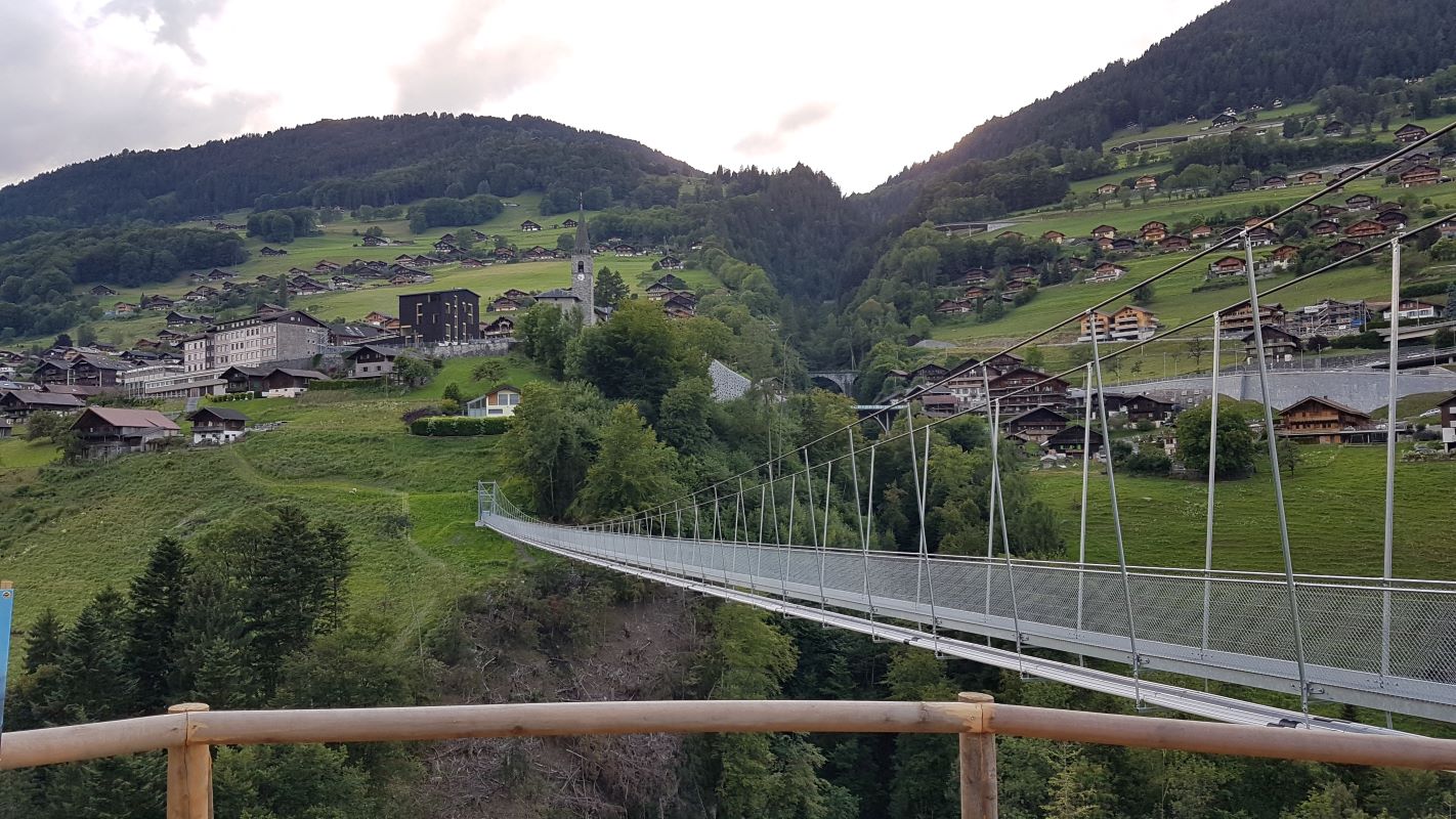 Traverser le pont suspendu d’une longueur de 185 mètres pour une hauteur de 75 mètres et qui vous ramène au coeur du village de Troistorrents.