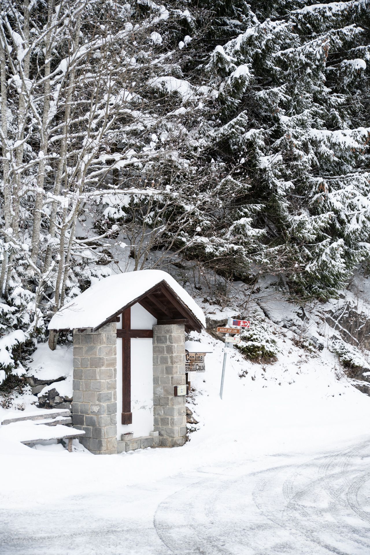 L’Oratoire du Pont des Moulins se trouve sur un chemin étroit surplombant la route principale en direction du Grand Paradis.