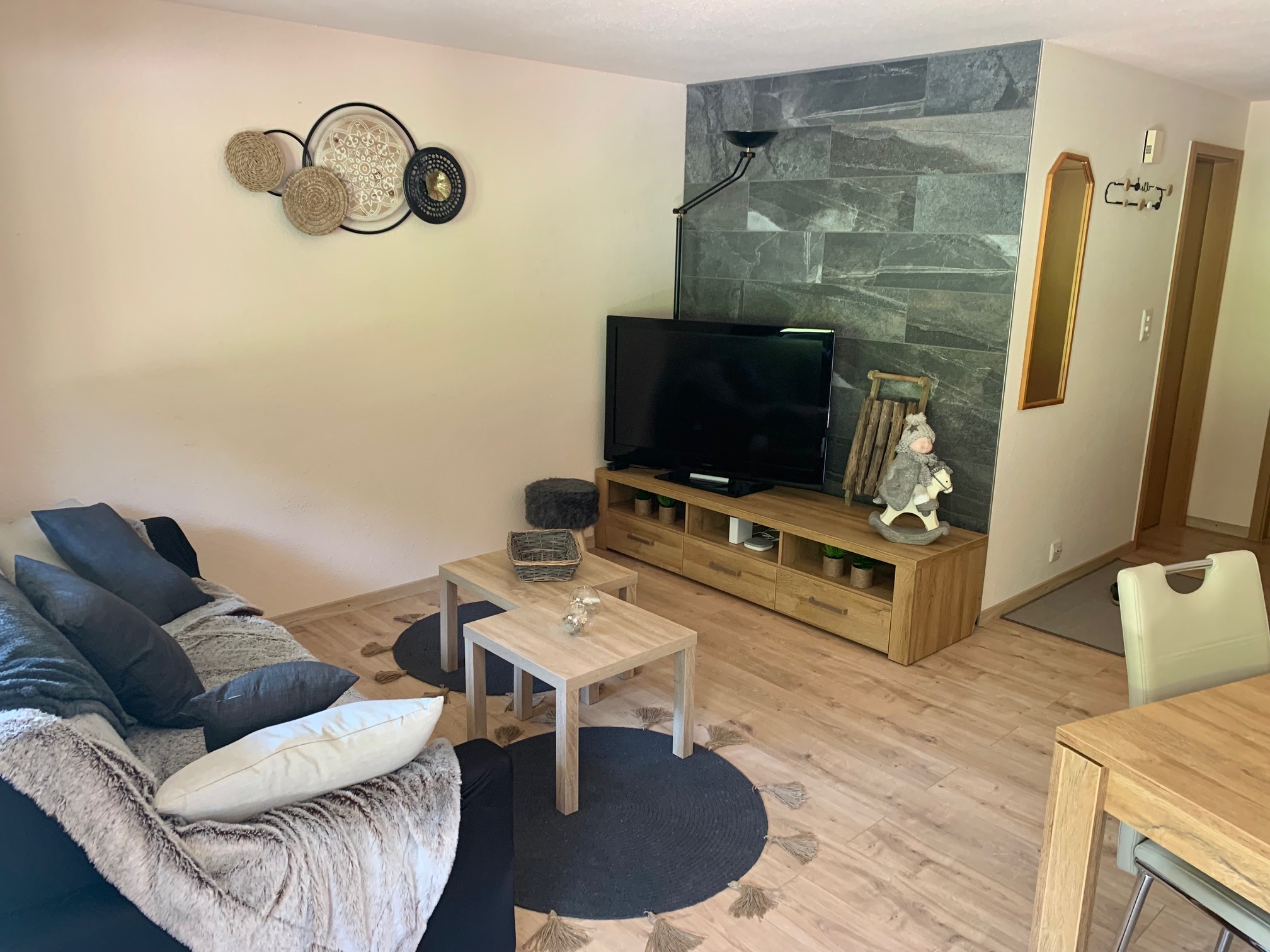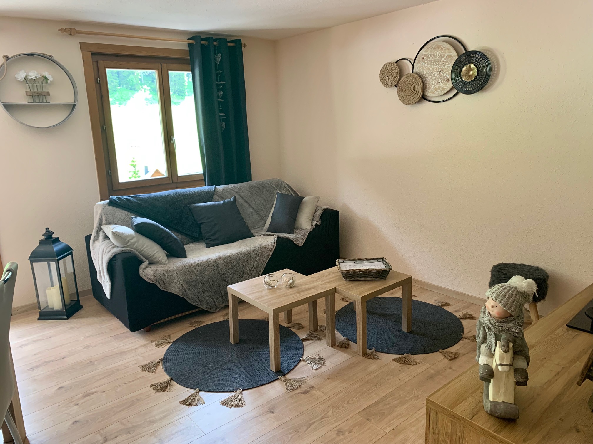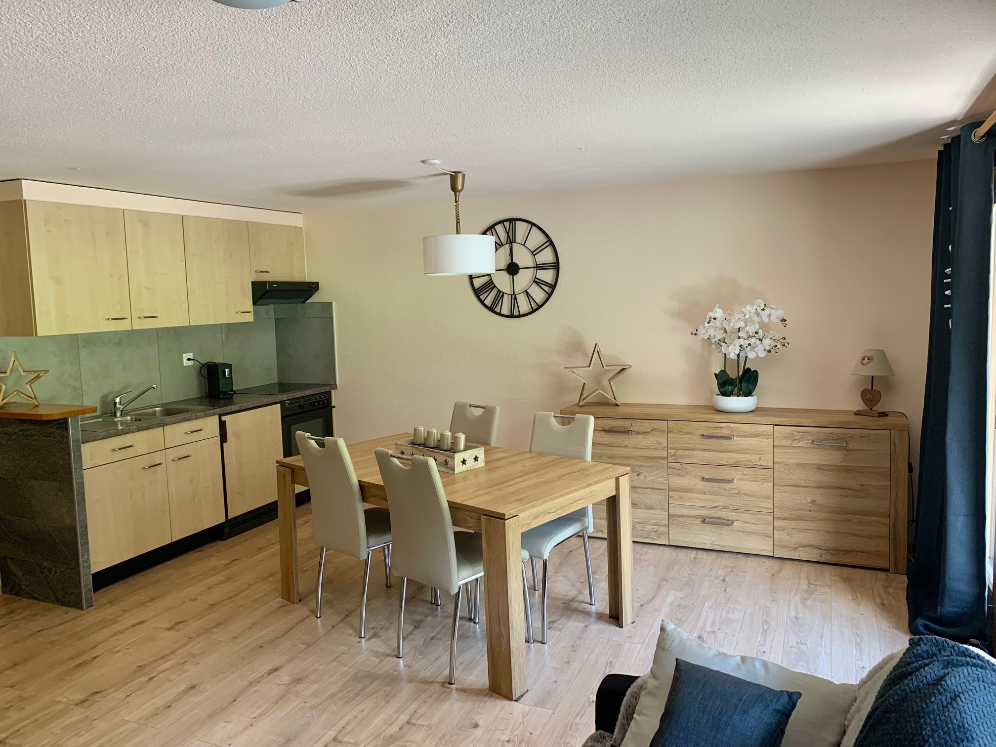 Appartement 2.5 pièces de 51m2 (balcon de 9m2) situé au 1er étage, comprenant: une entrée, séjour avec canapé-lit 2 places (160x200cm), TV câblée, Wifi, cuisine ouverte avec 4 plaques de cuisson, four, micro-onde, machine à café « Delizio », caquelon à fondue, grille-pain, bouilloire électrique, table avec 6 chaises. Accès sur le balcon avec 1 table et 6 chaises. 1 chambre à coucher avec 1 lit double (160x200cm), 1 armoire, 1 salle de bain avec douche/lavabo et WC. 1 place de parc.