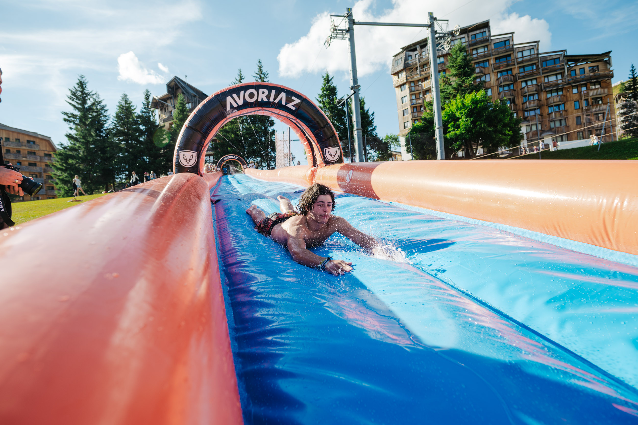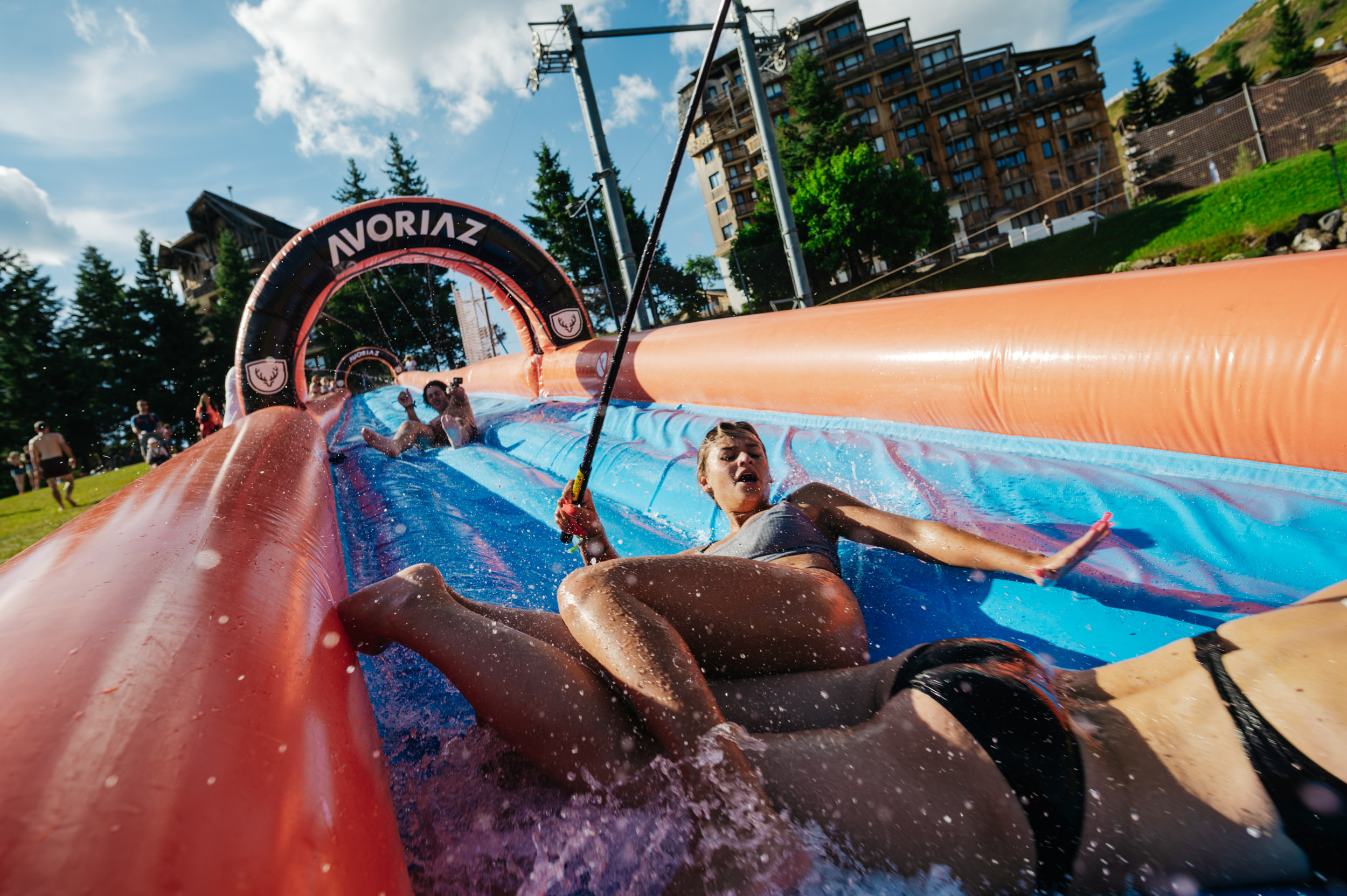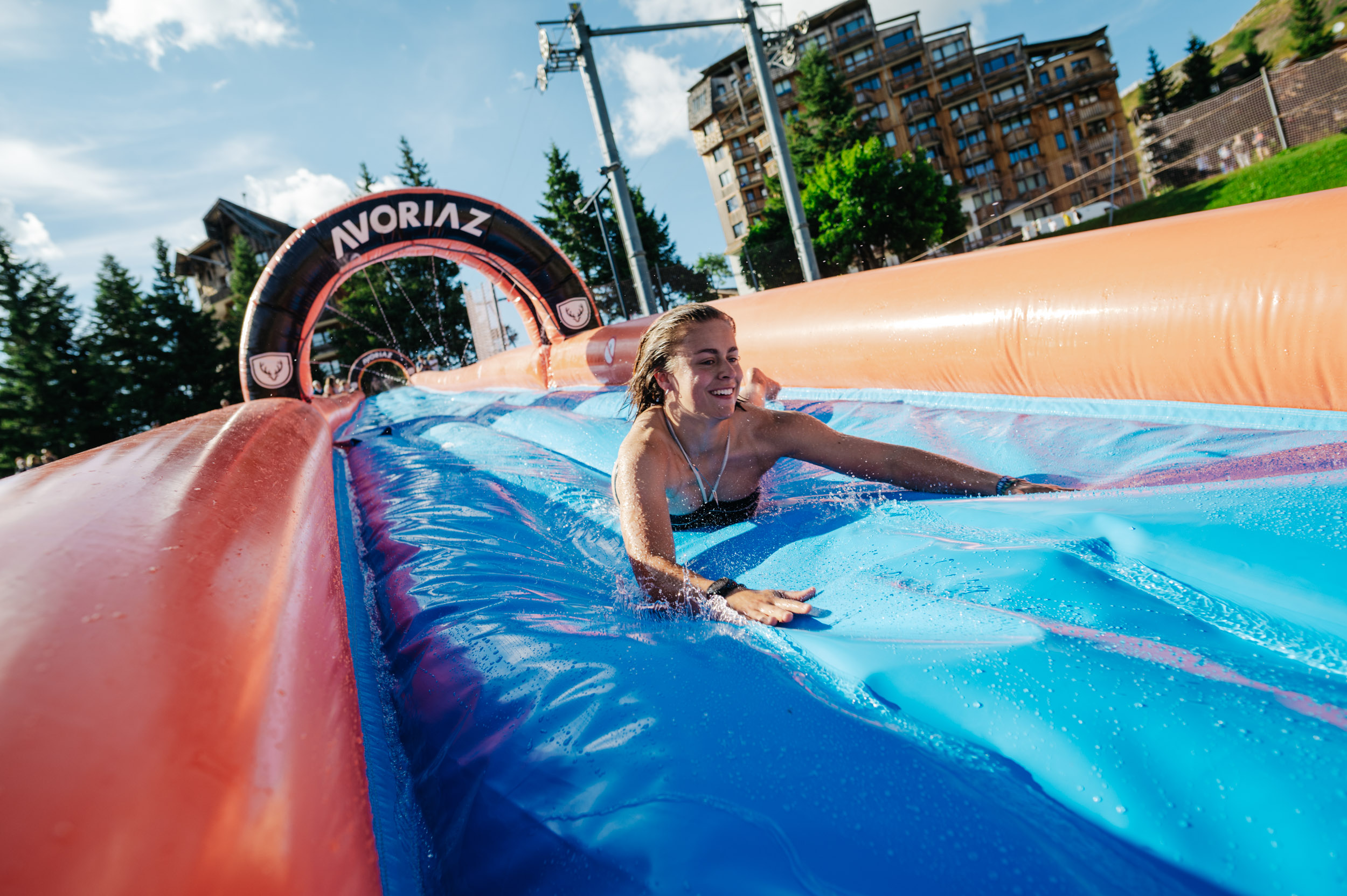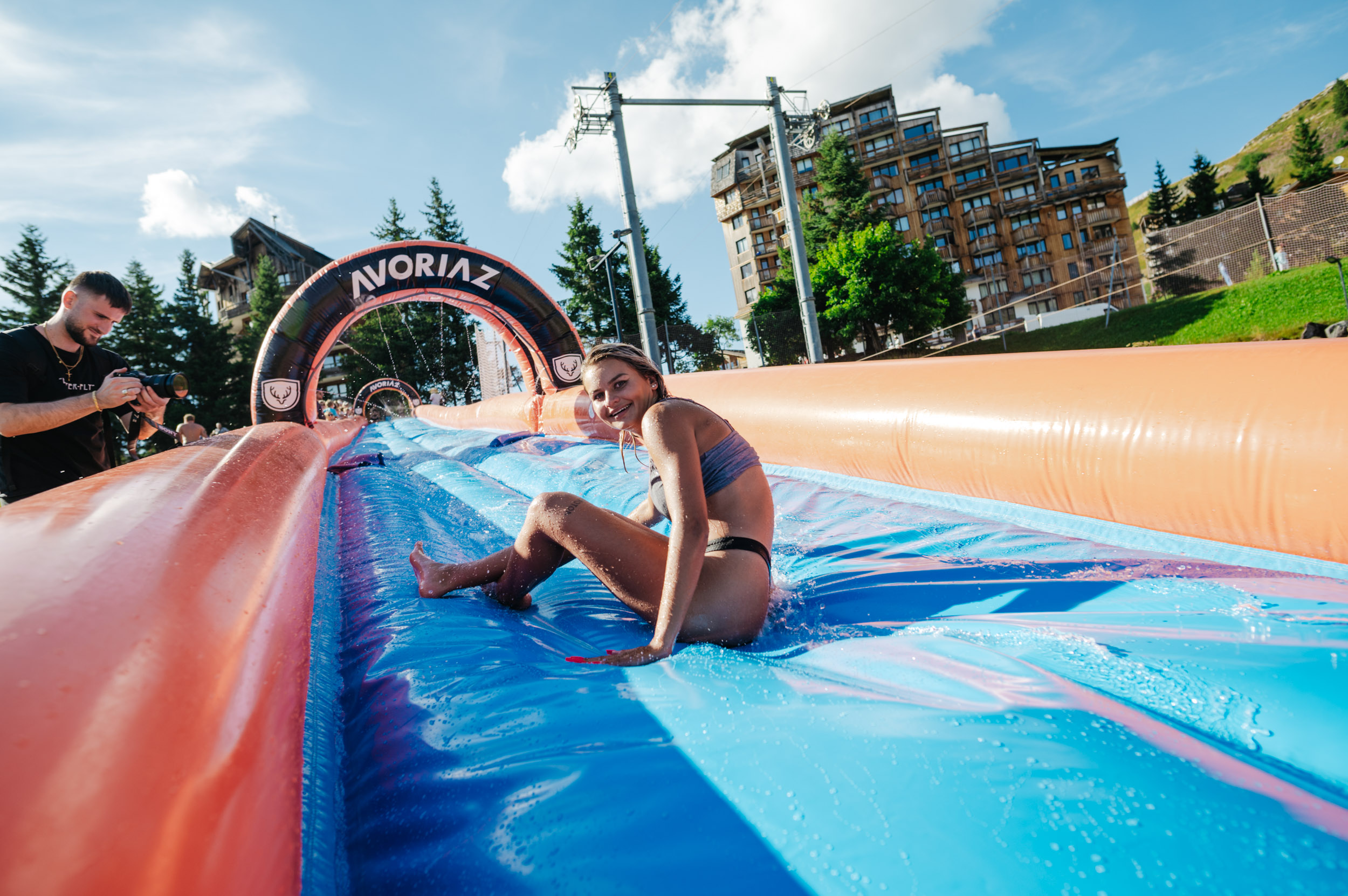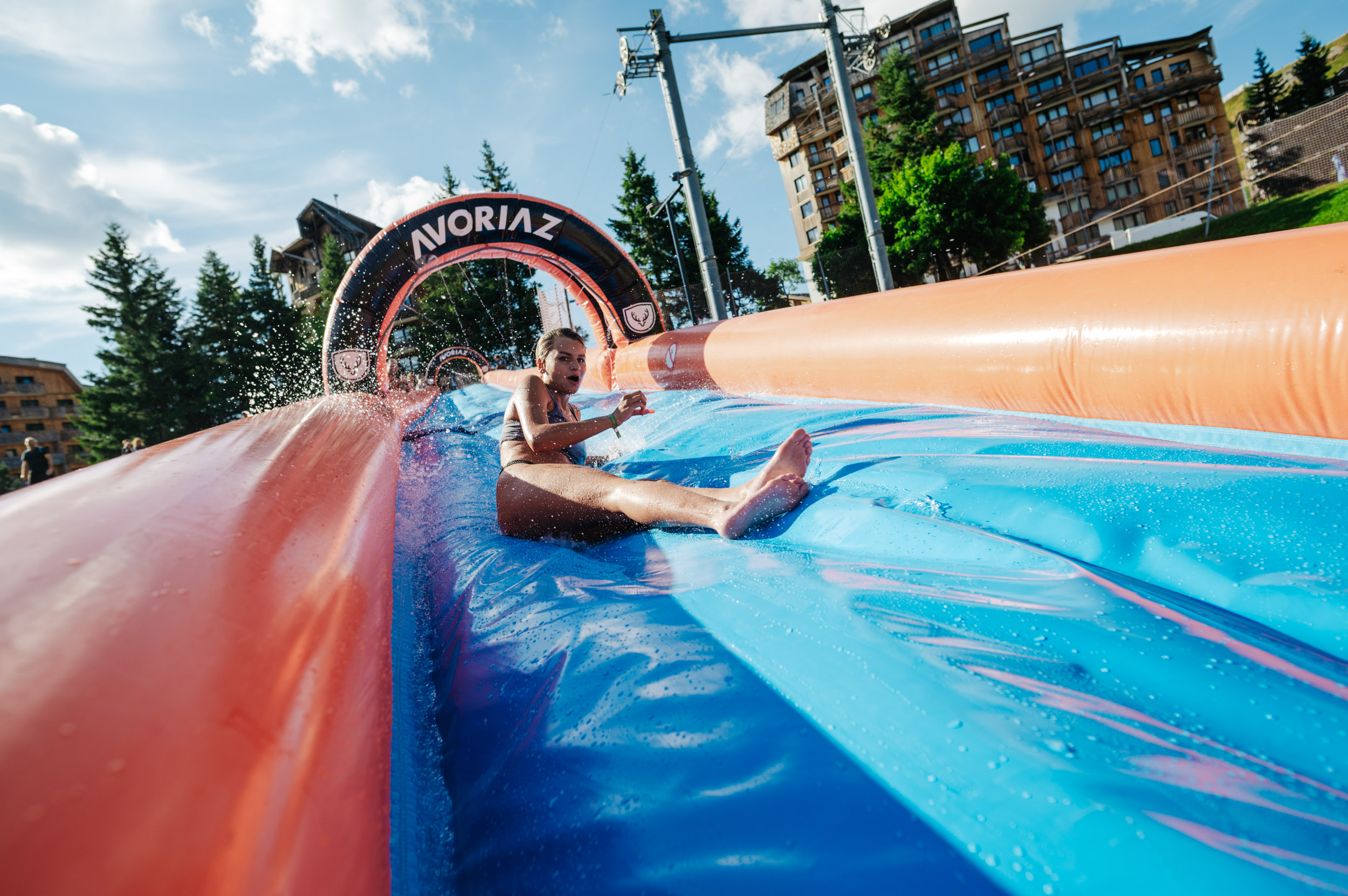 Lancez-vous dans un ventriglisse gonflable de 60 mètres depuis le haut de la piste des dromonts. Rafraîchissement garanti !