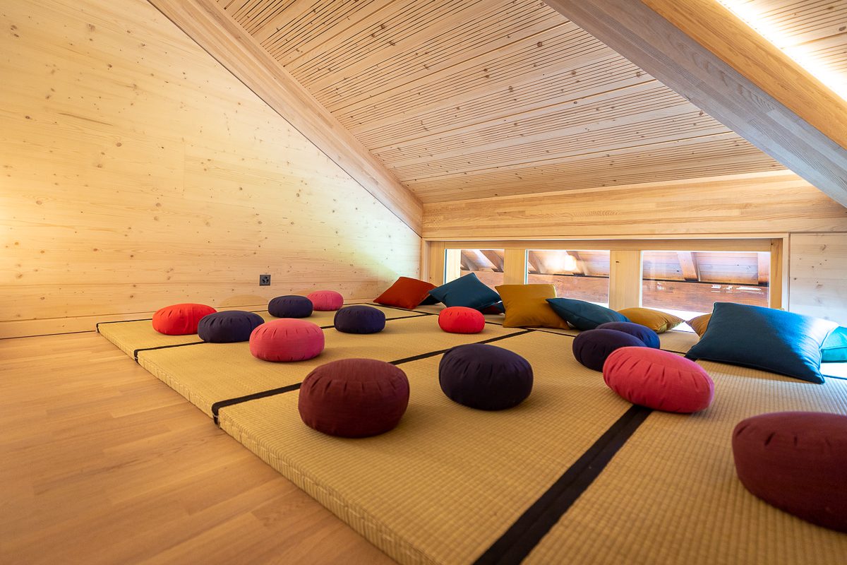 Il comprend 2 vestiaires équipés de douches, une cuisine et sa salle à manger, des salles de repos, de méditation, un appartement pour 4 personnes en chambre double et une chambre double en attique avec lits séparés. Cette magnifique salle de 121 m2 polyvalente, équipée selon les exigences du youga Iyengar, accueillera vos prochains stages de yoga, tai-chi, masterclasses de musique…
