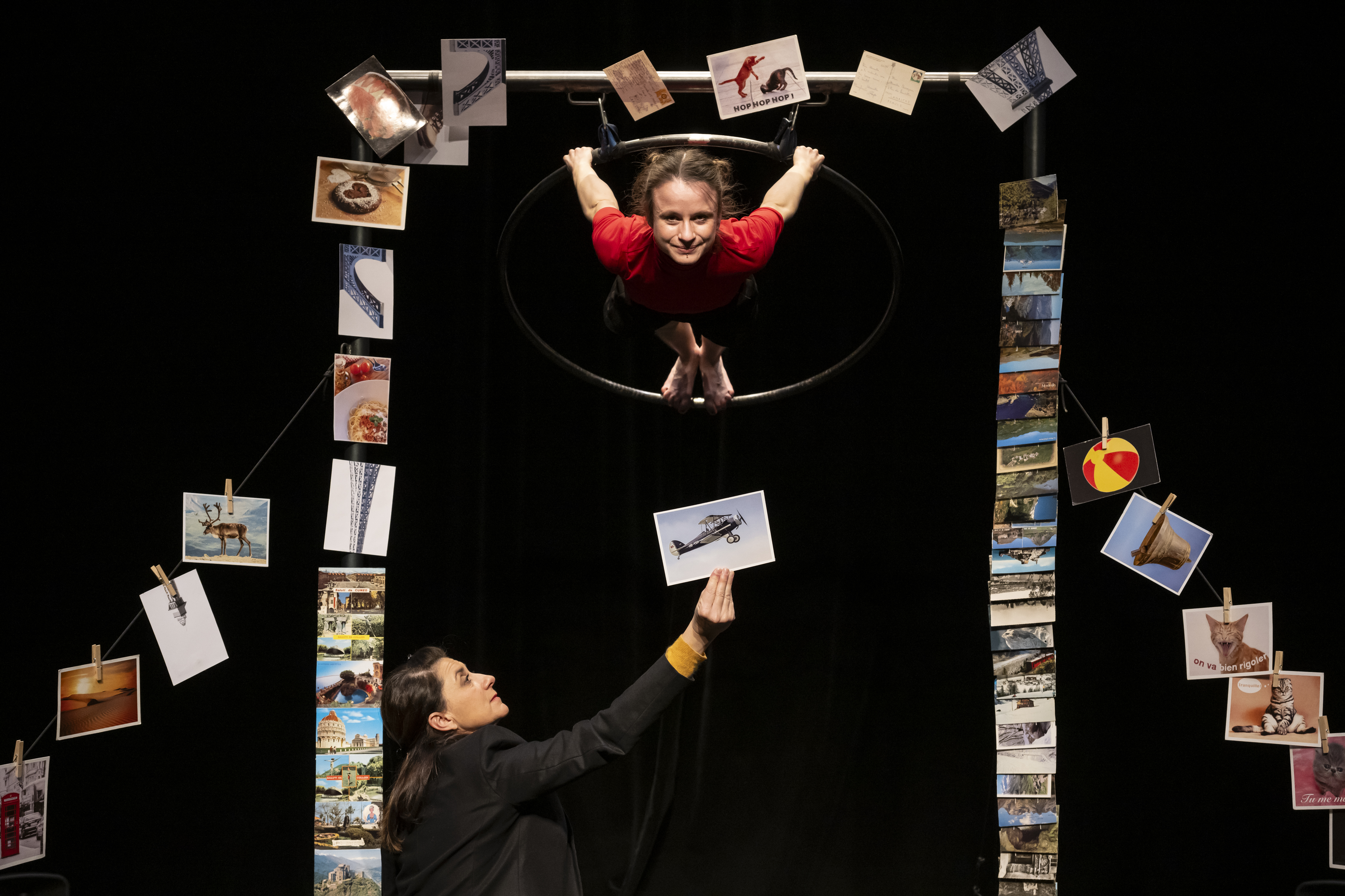 Dans la Variation 1, c’est à partir de cartes postales et d’un cerceau aérien que se raconte la transmission du goût du voyage d’une grand-mère à sa petite-fille.