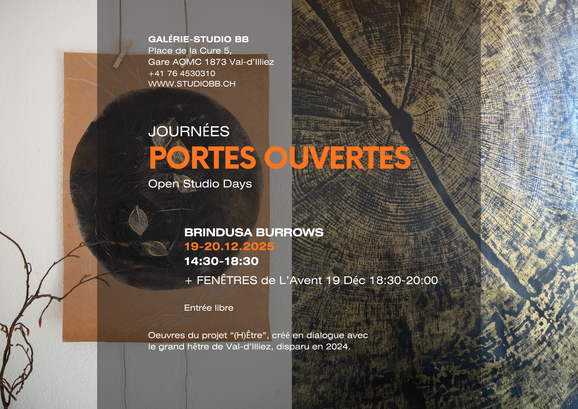 Passionnés d’art ou simples curieux, l’atelier de l’artiste plasticienne Brindusa Burrows vous ouvre ses portes. Le 19 décembre de 18h30 à 20h00 aura lieu également les Fenêtres de l’Avent pour partager un moment chaleureux tout en découvrant les œuvres du projet « (H)Être », réalisées cette année en dialogue avec le grand hêtre de Val-d’Illiez, abattu en 2024, ainsi que quelques nouveautés.