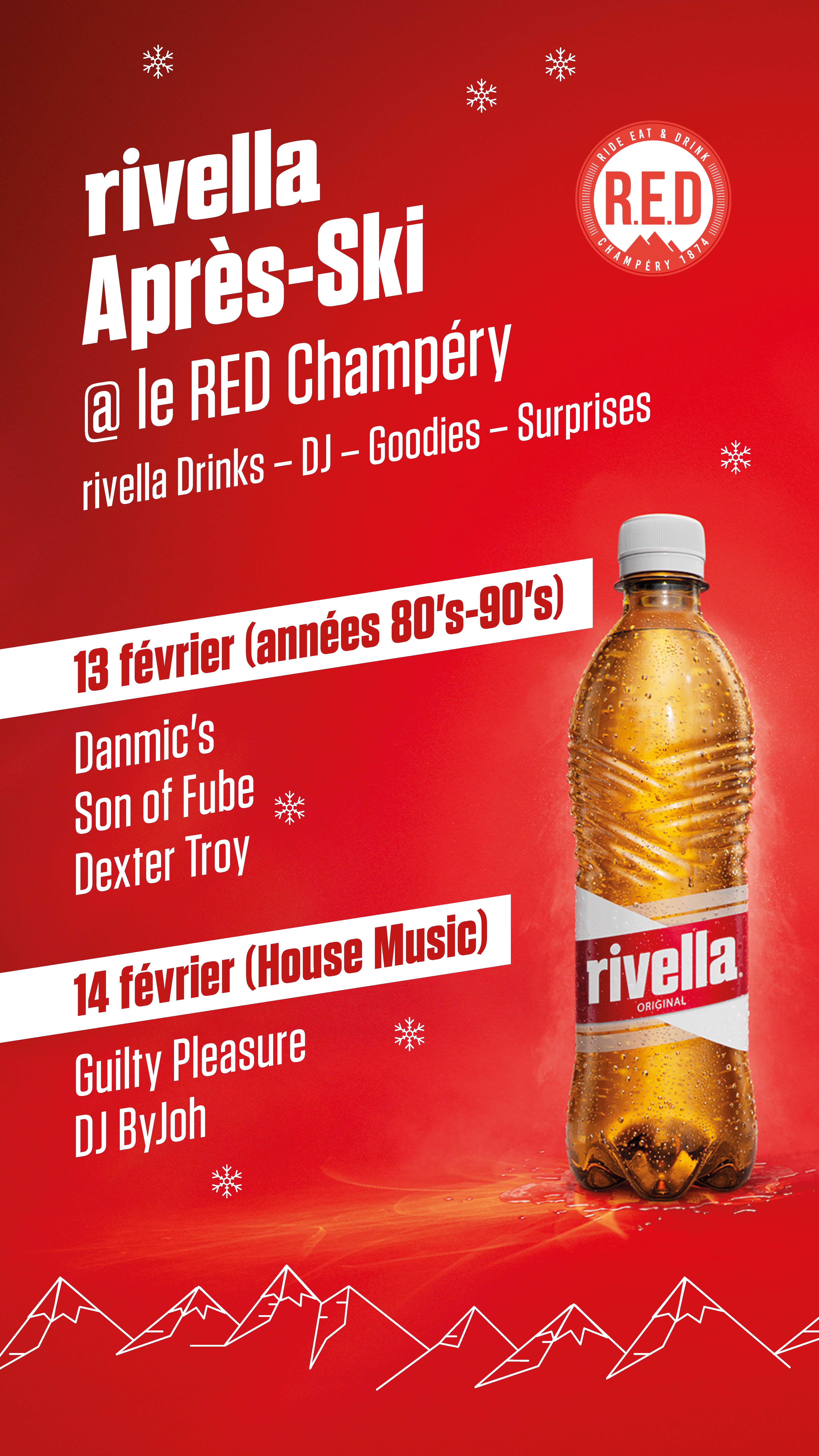 Pour le « Rivella Après-ski », la terrasse du RED à Champéry sera au couleur de Rivella les 13 et 14 février !