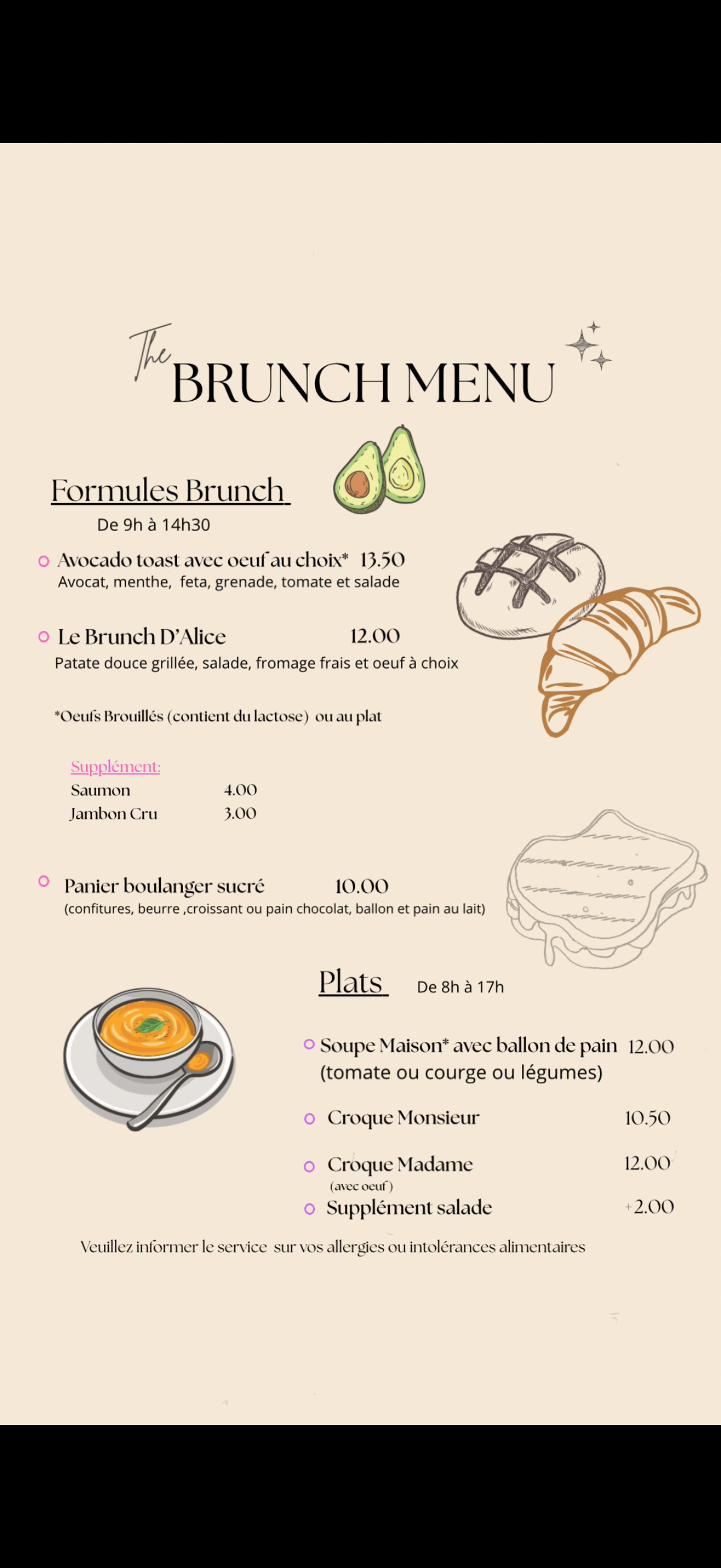 Pour les petites et grandes faims, laissez-vous tenter par nos brunchs revisités, comme l’avocado toast ou le brunch d’Alice à base de patate douce façon tartine, sans oublier nos soupes et croque-monsieur, devenus des incontournables.