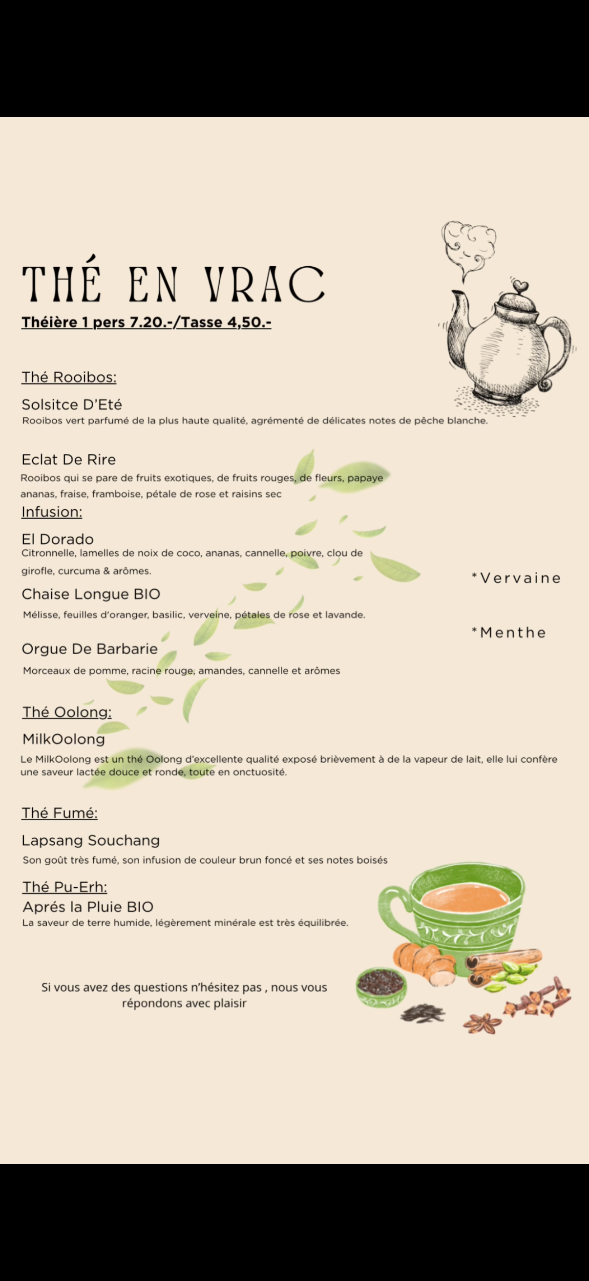 Venez découvrir nos brunchs, soupes et croque-monsieur ainsi qu'un large choix de thés en vrac de qualité, matcha, chai, cafés ainsi que des boissons chaudes et fraîches maison.