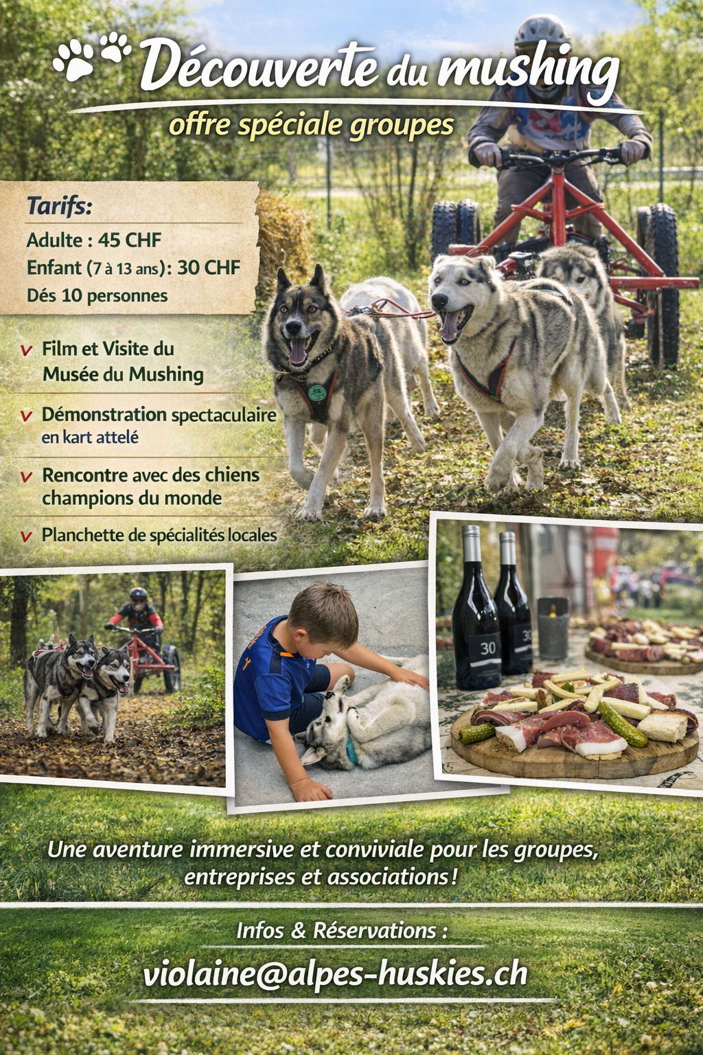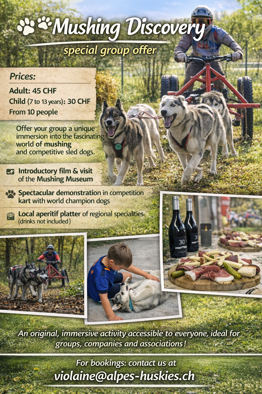 Offrez à votre groupe une immersion unique dans l’univers passionnant du mushing et des chiens de traîneau de compétition !