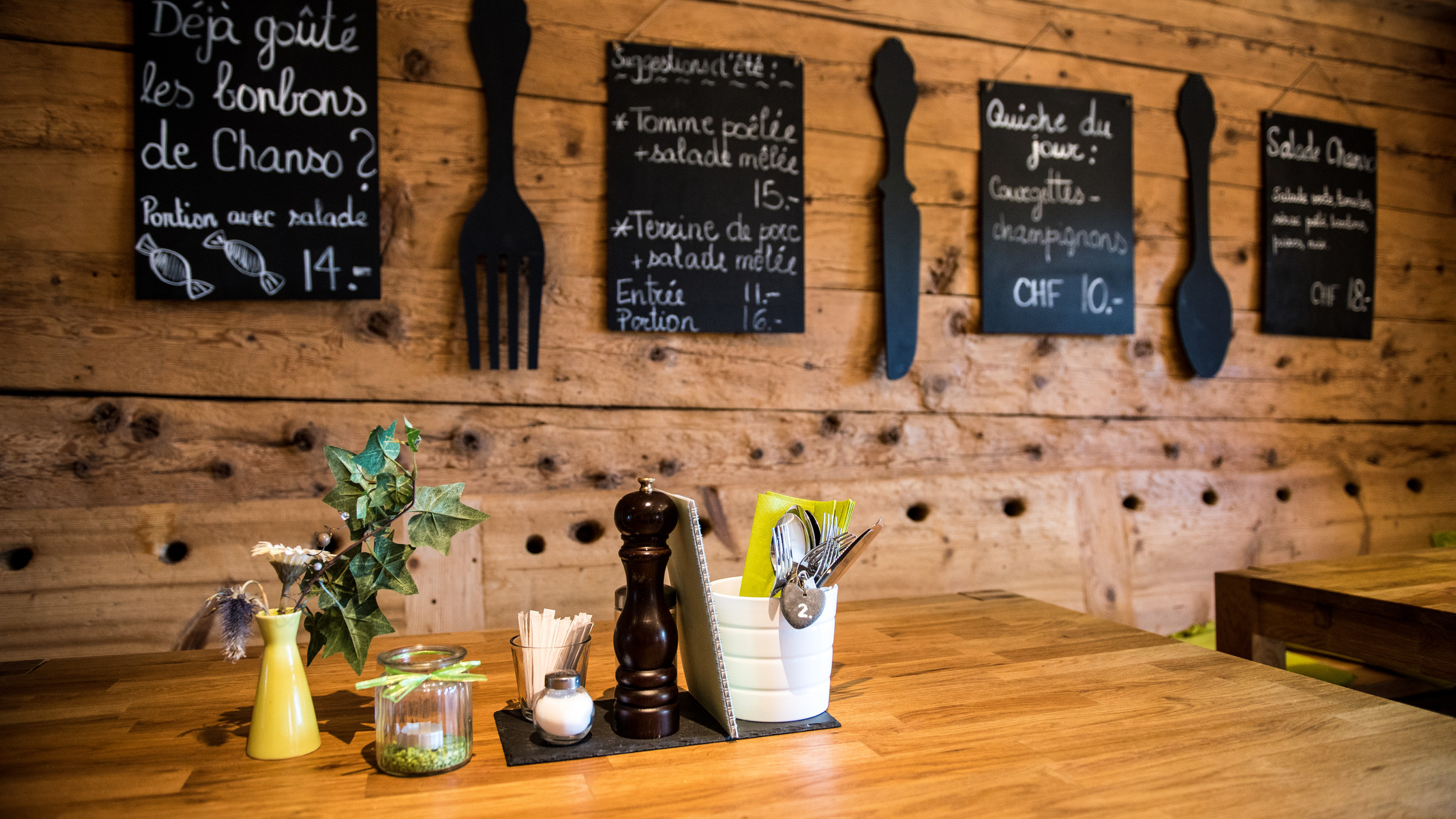 Croûte au fromage, fondue au fromage, pâtes du chalet, planchettes ou le célèbre Caquelon du Chanso (Boeuf mariné aux herbes, risotto au vin rouge, sauces maison).