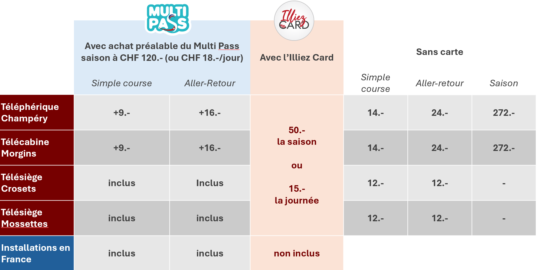 - Multi Pass saison : 120.- pour les adultes ou 95.- les jeunes de 5 à 25 ans