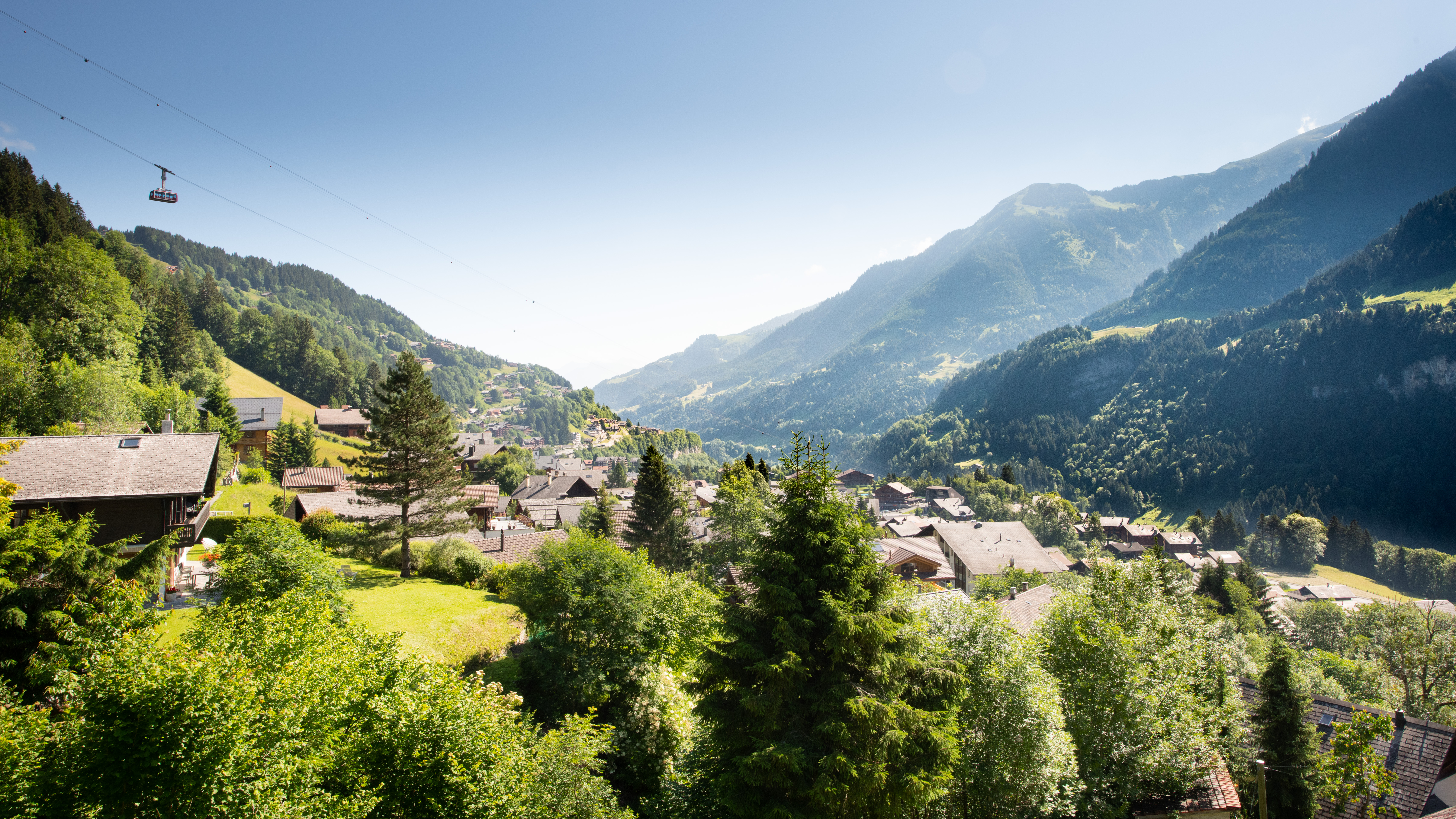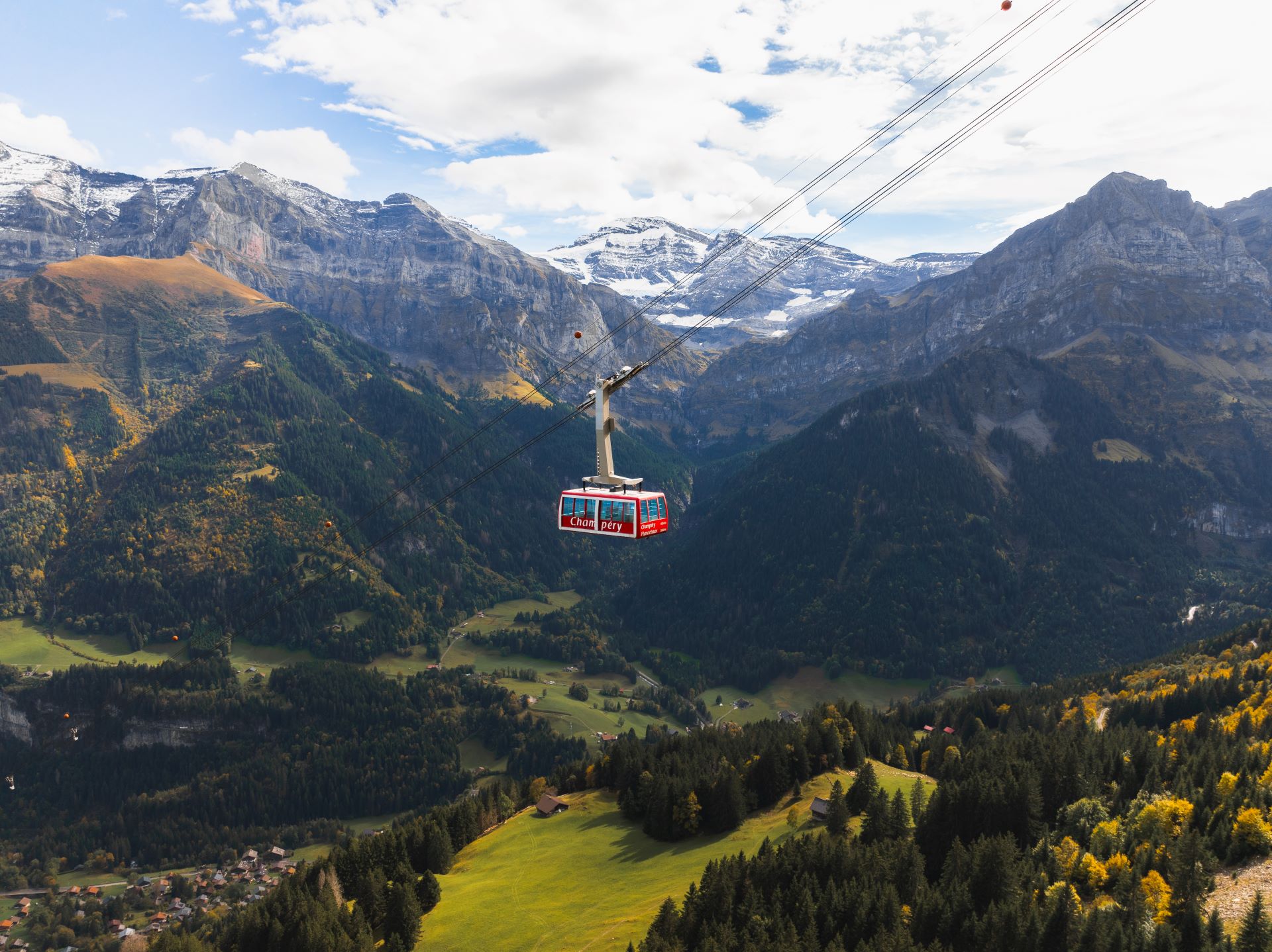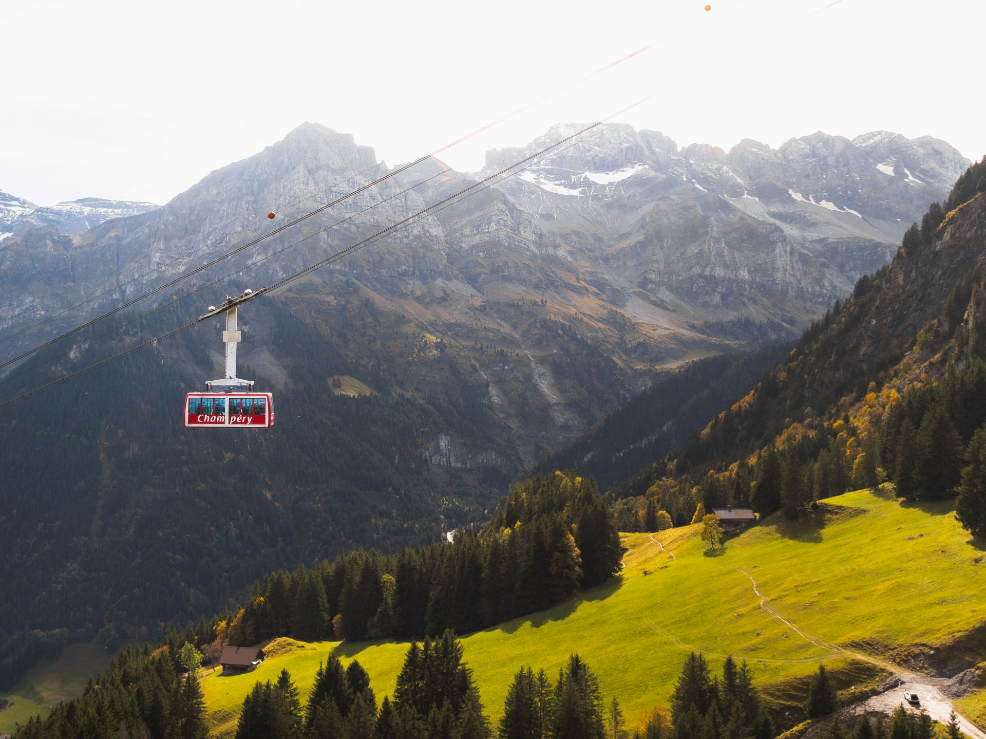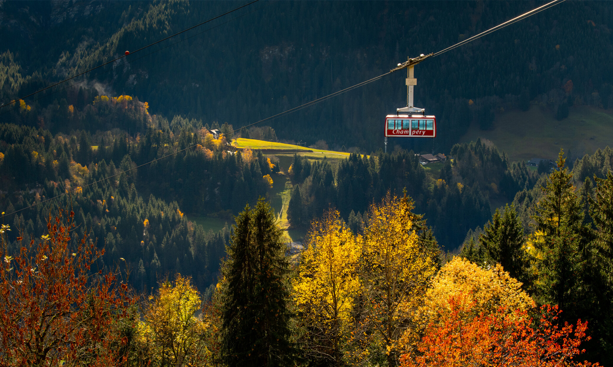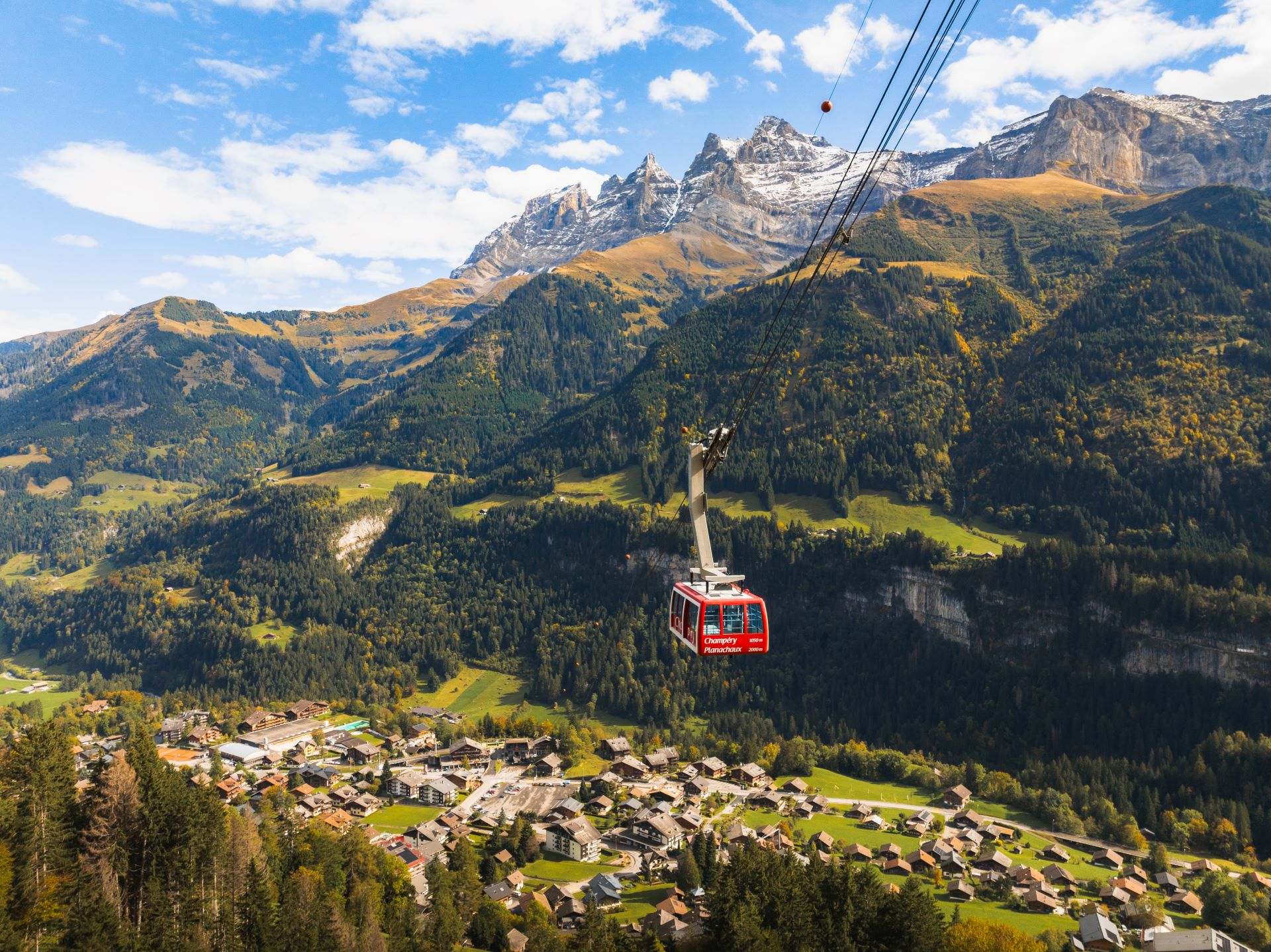 Téléphérique construit en 1987 avec une dénivellation de 899 m pour un trajet de 5 minutes seulement, situé à l'arrivée de la ligne AOMC à Champéry.